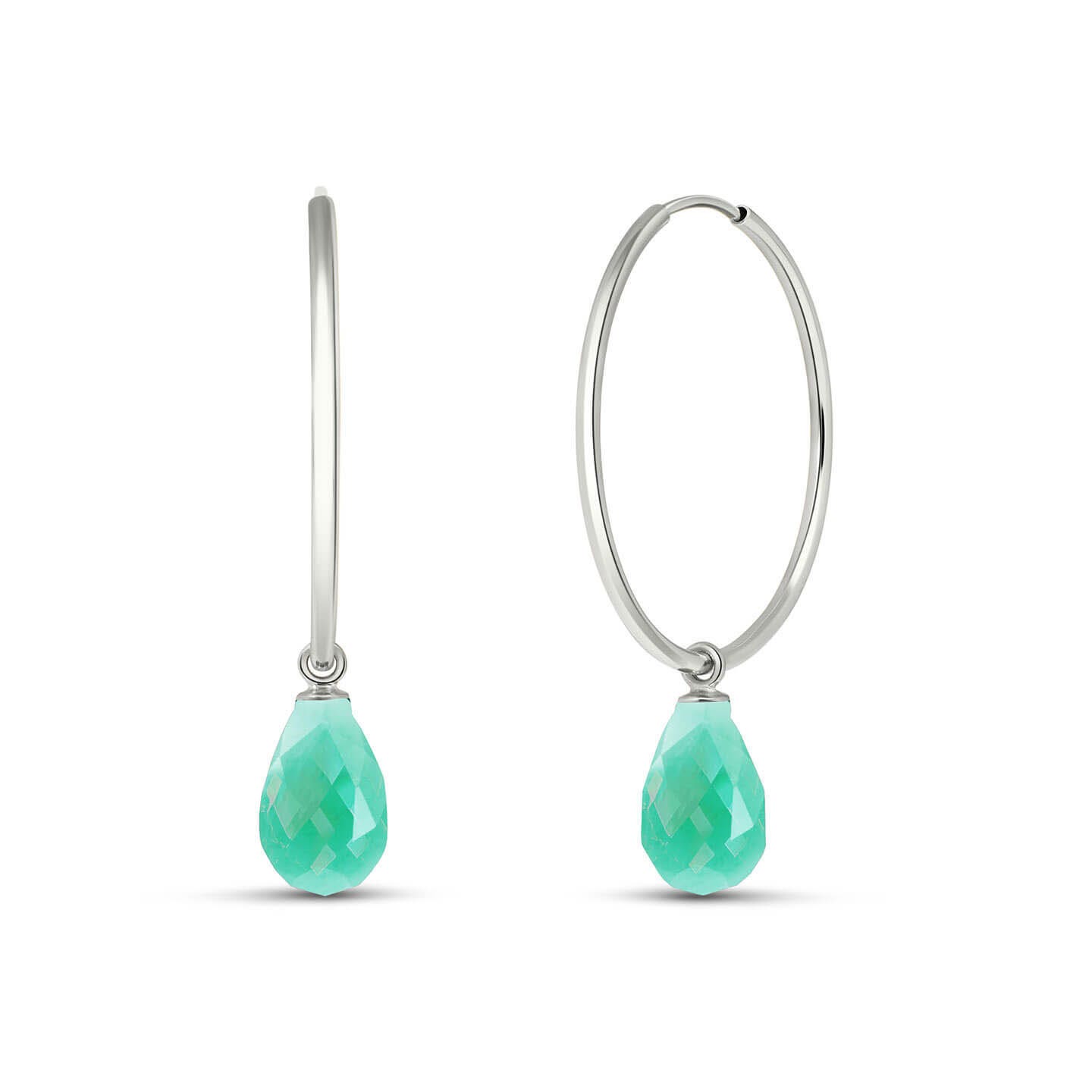 Emerald Hoop Earrings handcrafted in solid white gold. Two genuine emeralds, total 6.6 ct for both earrings combined. Briolette cut. Size: 6.1 x 34.3 mm (0.24 x 1.35 in). Material: 9ct White Gold. Total metal weight: 2.4 gr. 2 briolette cut emeralds (9 x 6 mm) = 6.6 ct total for pair. Colour: Green. Stone cut: Briolette Cut. Anniversary: 20th Anniversary, 35th Anniversary. Birthstone: May.