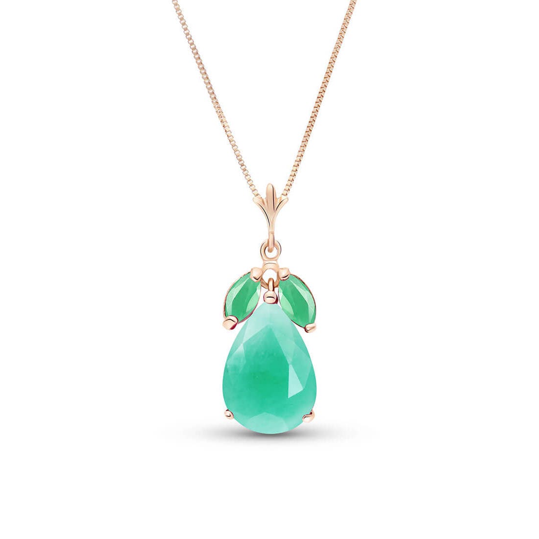 Emerald Pendant Necklace handcrafted in rose gold plated 9ct gold. Three gemstones, total 4 ct. Pear cut. The pendant is suspended from a rose gold box chain with spring clasp. Size: 9.1 x 24.6 mm (0.36 x 0.97 in). Material: 9ct Rose Gold. Total metal weight: 2.9 gr. 1 pear cut emerald (9 x 13 mm) = 3.5 ct. 2 marquise cut emeralds (6 x 3 mm) = 0.5 ct total. Colour: Green. Stone cut: Pear Cut. Anniversary: 20th Anniversary, 35th Anniversary. Birthstone: May.