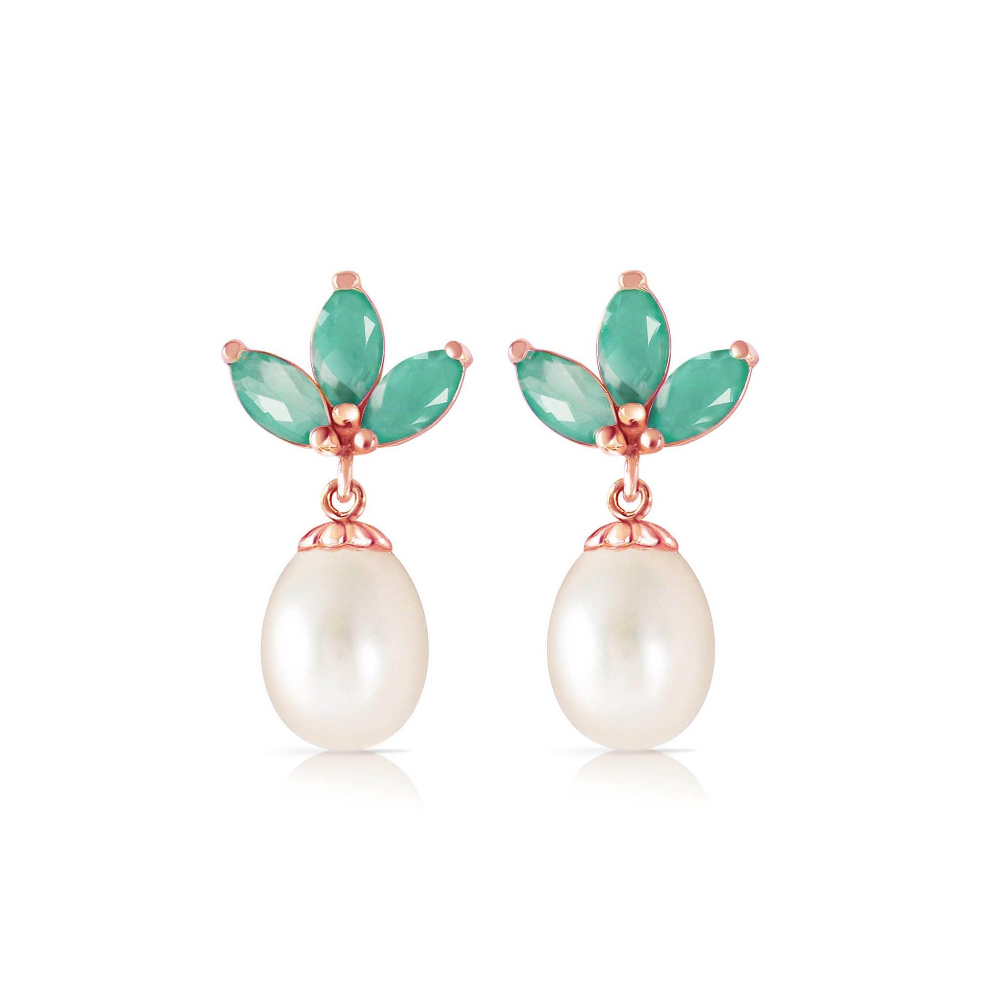 Emerald & Pearl Chandelierdrop Earrings handcrafted in rose gold plated 9ct gold. Eight gemstones, total 9.5 ct for both earrings combined. Marquise cut. Size: 11.7 x 22.1 mm (0.46 x 0.87 in). Material: 9ct Rose Gold. Total metal weight: 3.4 gr. 6 marquise cut emeralds (6 x 3 mm) = 1.5 ct total for pair. 2 freshwater pearls (10 x 8 mm) = 8 ct total for pair. Colour: Green. Stone cut: Marquise Cut. Anniversary: 20th Anniversary, 35th Anniversary. Birthstone: May.