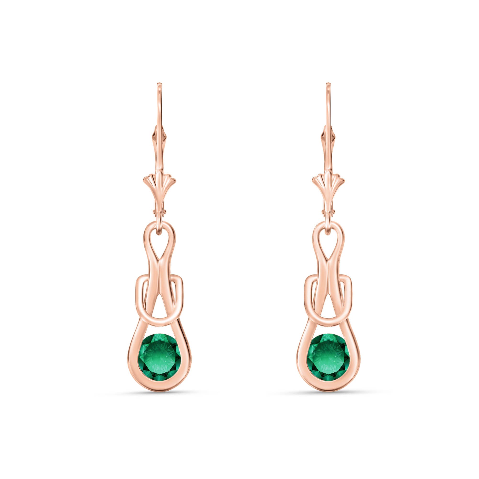 Leverback Earrings handcrafted in rose gold plated 9ct gold. Two genuine emeralds, total 1.3 ct for both earrings combined. Round cut. Size: 7.4 x 33.5 mm (0.29 x 1.32 in). Material: 9ct Rose Gold. Total metal weight: 2.3 gr. 2 round cut emeralds (5 x 5 mm) = 1.3 ct total for pair. Colour: Green. Stone cut: Round Cut. Anniversary: 20th Anniversary, 35th Anniversary. Birthstone: May.