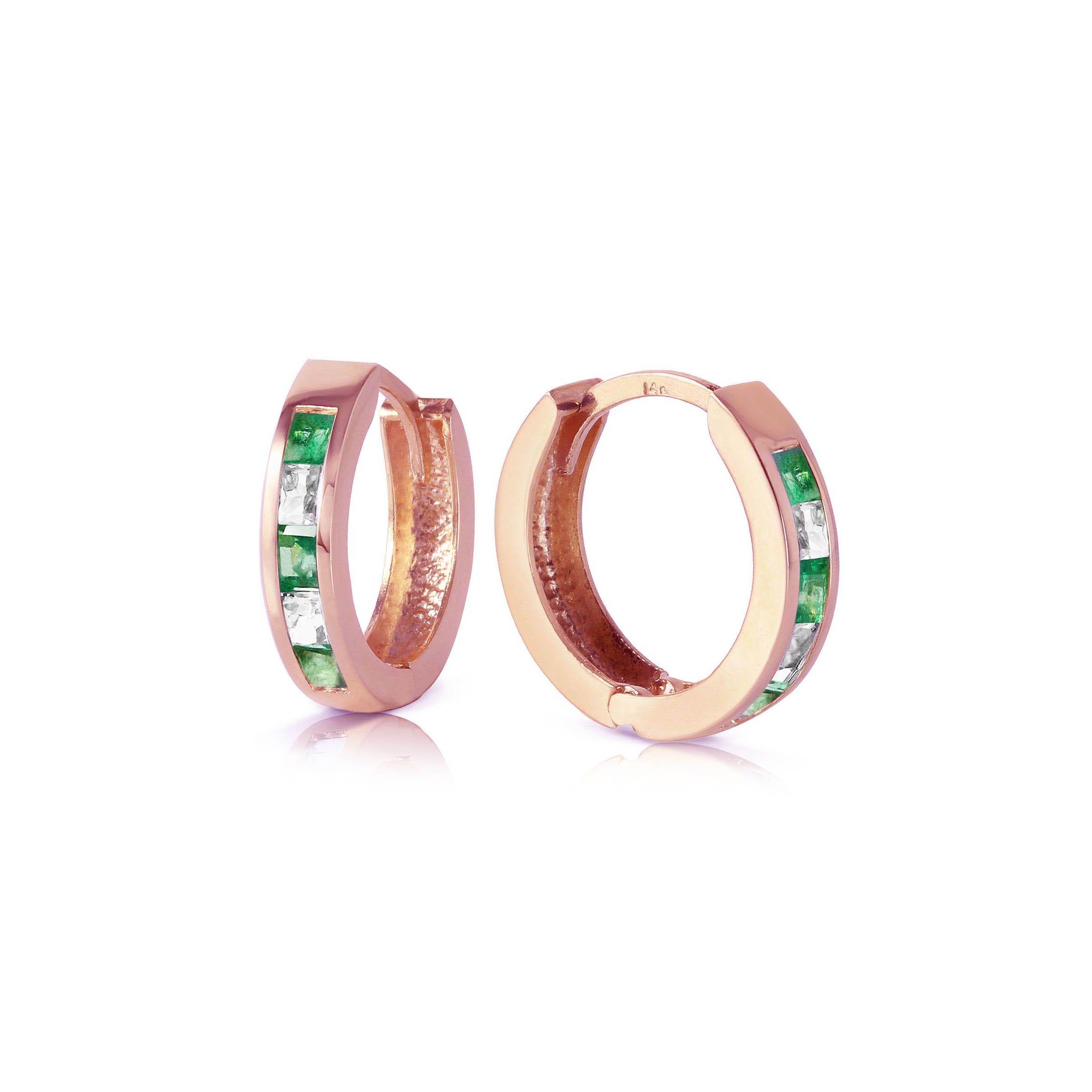 Emerald & White Topaz Hoop Earrings handcrafted in rose gold plated 9ct gold. Ten gemstones, total 1.26 ct for both earrings combined. Princess cut. Size: 3.3 x 14.5 mm (0.13 x 0.57 in). Material: 9ct Rose Gold. Total metal weight: 1.2 gr. 6 princess cut emeralds (2.5 x 2.5 mm) = 0.78 ct total for pair. 4 princess cut white topaz (2.5 x 2.5 mm) = 0.48 ct total for pair. Colour: Green. Stone cut: Princess Cut. Anniversary: 20th Anniversary, 35th Anniversary. Birthstone: May.