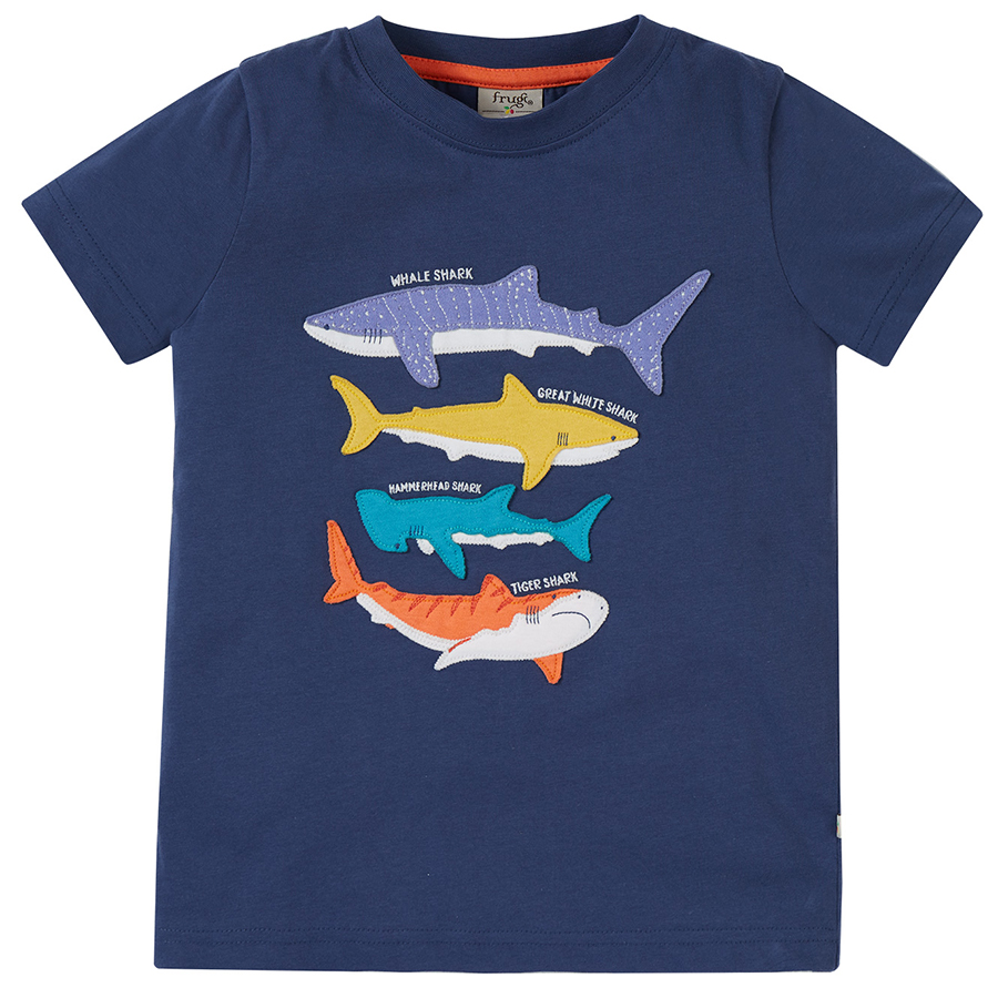 Featuring shark characters on a Navy Blue colour Frugi’s Avery Applique T-Shirt is made from soft organic cotton and is great for layering with shorts or dungarees. With popper fastenings on the shoulders in sizes up to 4 years for easy dressing.100