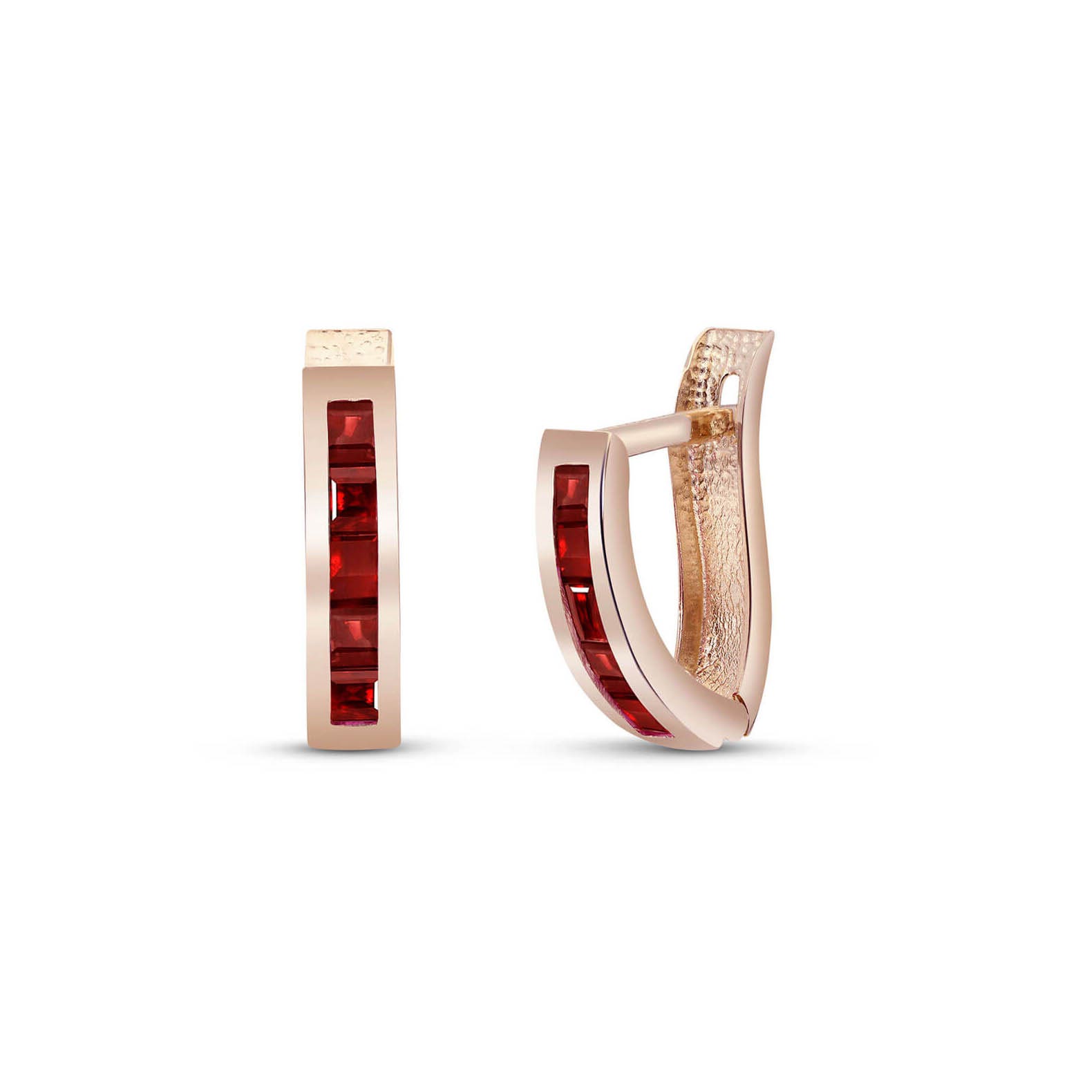 Garnet Hoop Huggie Earrings handcrafted in rose gold plated 9ct gold. Ten genuine garnets, total 1.3 ct for both earrings combined. Princess cut. Size: 3.6 x 16 mm (0.14 x 0.63 in). Material: 9ct Rose Gold. Total metal weight: 1.2 gr. 10 princess cut garnets (2.5 x 2.5 mm) = 1.3 ct total for pair. Colour: Red. Stone cut: Princess Cut. Anniversary: 2nd Anniversary. Birthstone: January.
