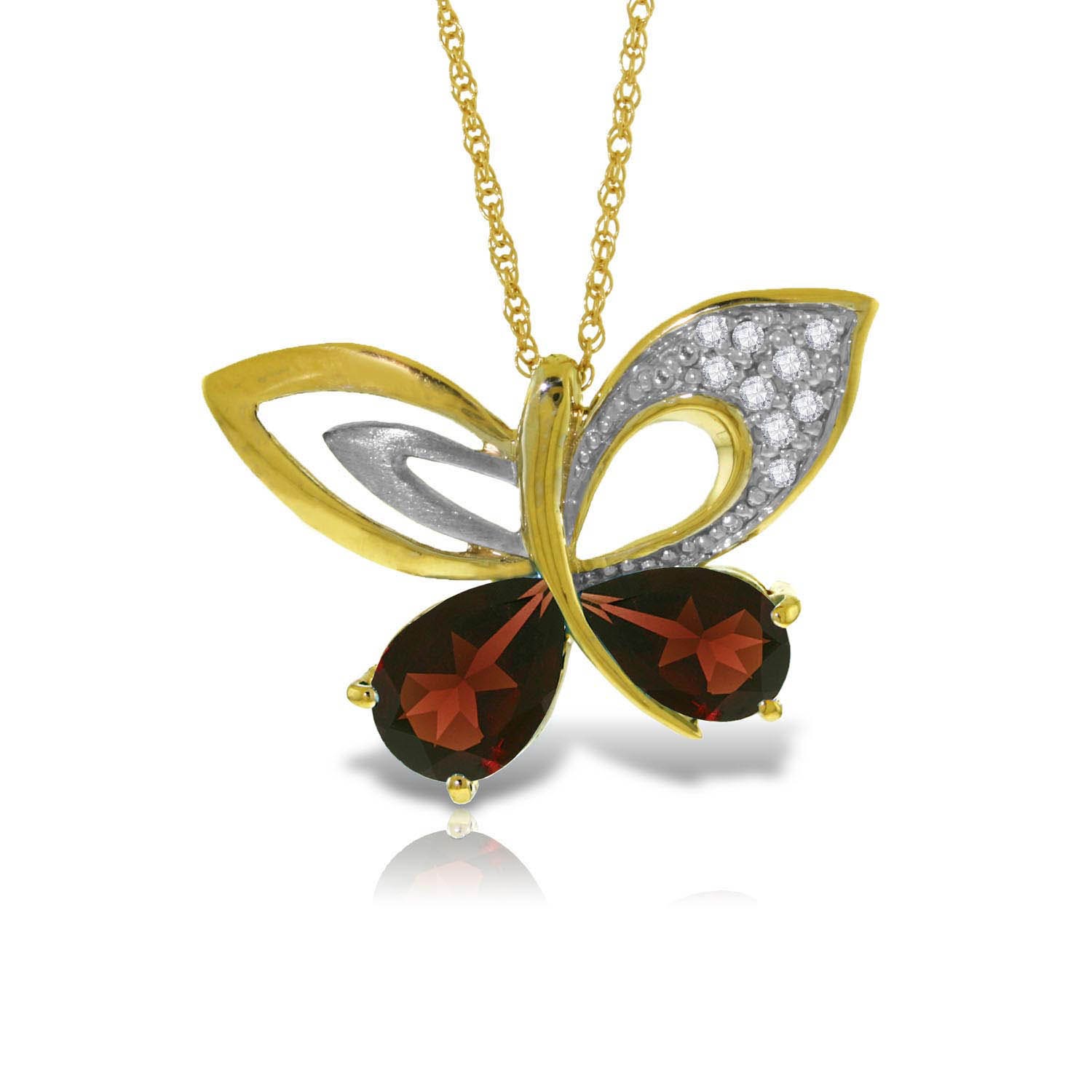 Garnet & Diamond Butterfly Pendant Necklace handcrafted in solid gold. Two gemstones, total 3.5 ct, nine diamonds, total 0.18 ct. Pear cut. The pendant hangs from a gold double link rope chain with spring clasp. Size: 27.9 x 19.8 mm (1.1 x 0.78 in). Material: 9ct Gold. Total metal weight: 4.24 gr. 1 pear cut garnet (10 x 7 mm) = 2 ct. 1 pear cut garnet (9 x 6 mm) = 1.5 ct. 9 round cut diamonds (K colour, I3 clarity) = 0.18 ct total. Colour: Red. Stone cut: Pear Cut. Anniversary: 2nd Anniversary. Birthstone: January.