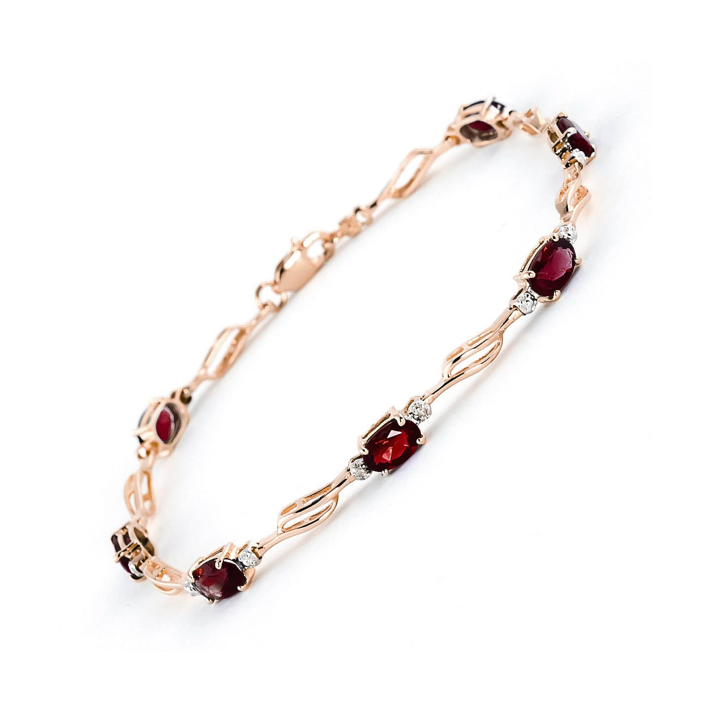 Garnet & Diamond Tennis Bracelet handcrafted in rose gold plated 9ct gold. Seven genuine garnets, total 3.38 ct, two diamonds, total 0.02 ct. Oval cut. Fastened by rose gold lobster clasp. Fits wrist up to 8.5″. Size: 4.3 mm (0.17 in). Material: 9ct Rose Gold. Total metal weight: 4.4 gr. 7 oval cut garnets (6 x 4 mm) = 3.38 ct total. 2 round cut diamonds (K colour, SI1 clarity) = 0.02 ct total. Colour: Red. Stone cut: Oval Cut. Anniversary: 2nd Anniversary. Birthstone: January.