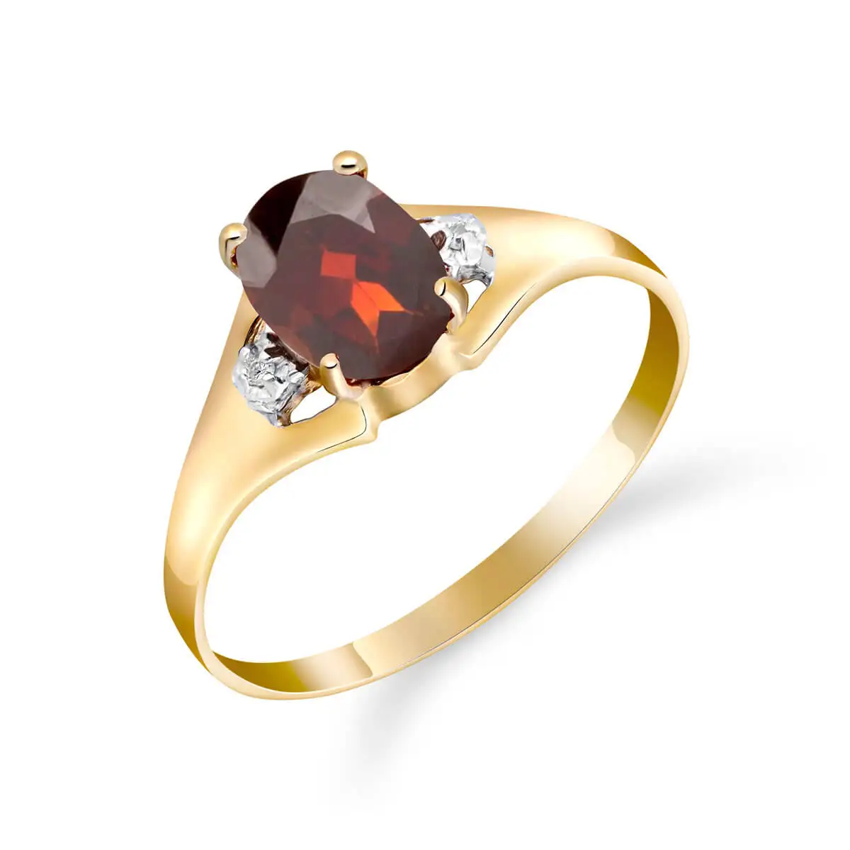 Garnet & Diamond Ring handcrafted in solid 18ct gold. Single 0.75 ct genuine garnet, two diamonds, total 0.01 ct. Oval cut. Available from sizes H to Z including half sizes. Size: 6.6 mm (0.26 in). Material: 18ct Gold. Total metal weight: 1.5 gr. 1 oval cut garnet (7 x 5 mm) = 0.75 ct. 2 round cut diamonds (K colour, I3 clarity) = 0.01 ct total. Colour: Red. Stone cut: Oval Cut. Anniversary: 2nd Anniversary. Birthstone: January.