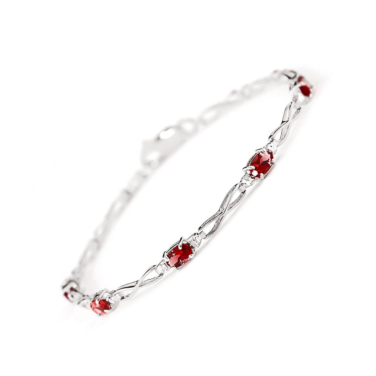Garnet & Diamond Tennis Bracelet handcrafted in solid white gold. Five genuine garnets, total 1.15 ct, two diamonds, total 0.02 ct. Oval cut. Fastened by white gold lobster clasp. Fits wrist up to 8.5″. Size: 3.3 mm (0.13 in). Material: 9ct White Gold. Total metal weight: 2.6 gr. 5 oval cut garnets (5 x 3 mm) = 1.15 ct total. 2 round cut diamonds (K colour, I3 clarity) = 0.02 ct total. Colour: Red. Stone cut: Oval Cut. Anniversary: 2nd Anniversary. Birthstone: January.