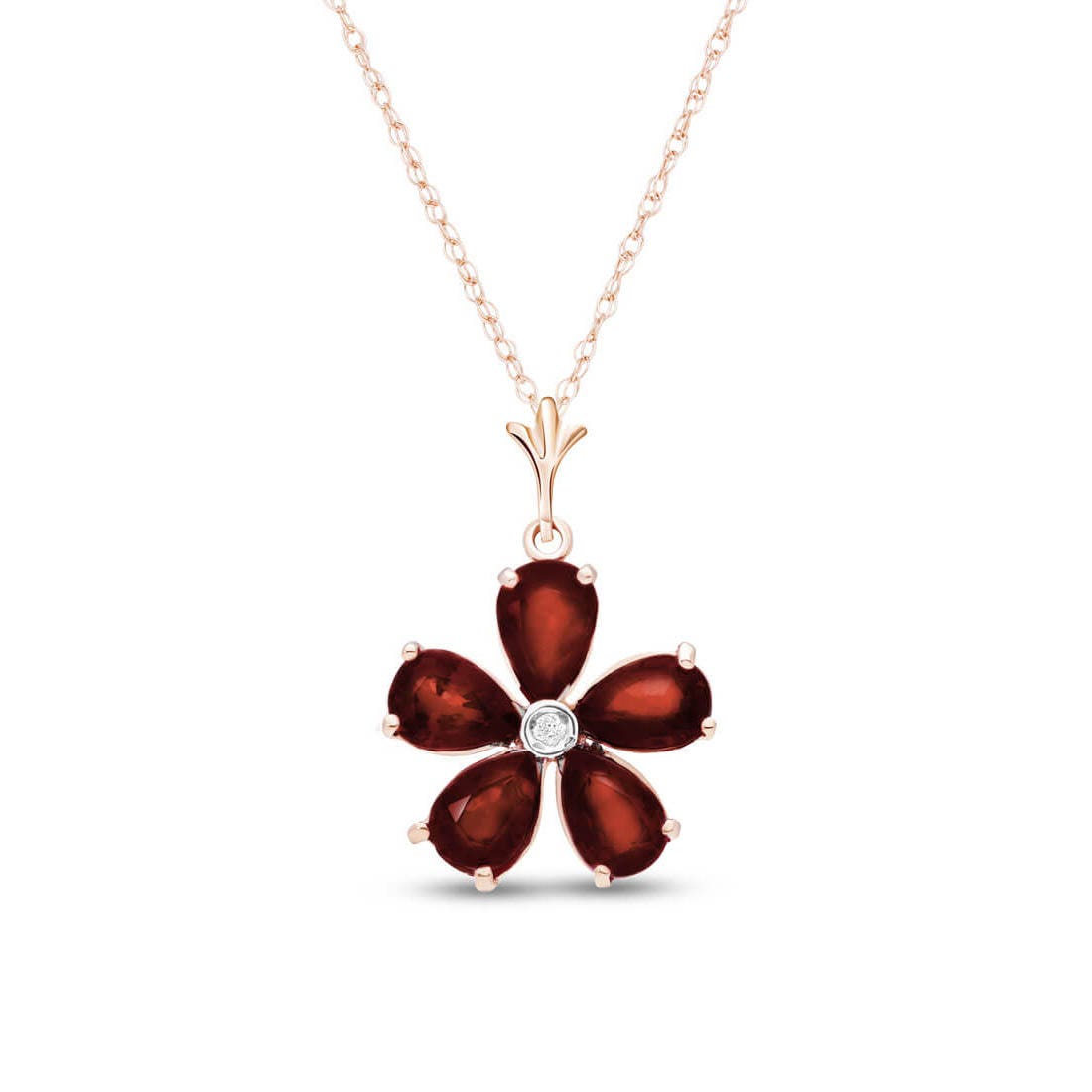 Garnet & Diamond Pendant Necklace handcrafted in rose gold plated 9ct gold. Five genuine garnets, total 2.2 ct, single 0.02 ct diamond. Pear cut. The pendant hangs from a rose gold double link rope chain with spring clasp. Size: 14.2 x 22.4 mm (0.56 x 0.88 in). Material: 9ct Rose Gold. Total metal weight: 2.24 gr. 5 pear cut garnets (6 x 4 mm) = 2.2 ct total. 1 round brilliant cut diamond (K colour, SI1 clarity) = 0.02 ct. Colour: Red. Stone cut: Pear Cut. Anniversary: 2nd Anniversary. Birthstone: January.
