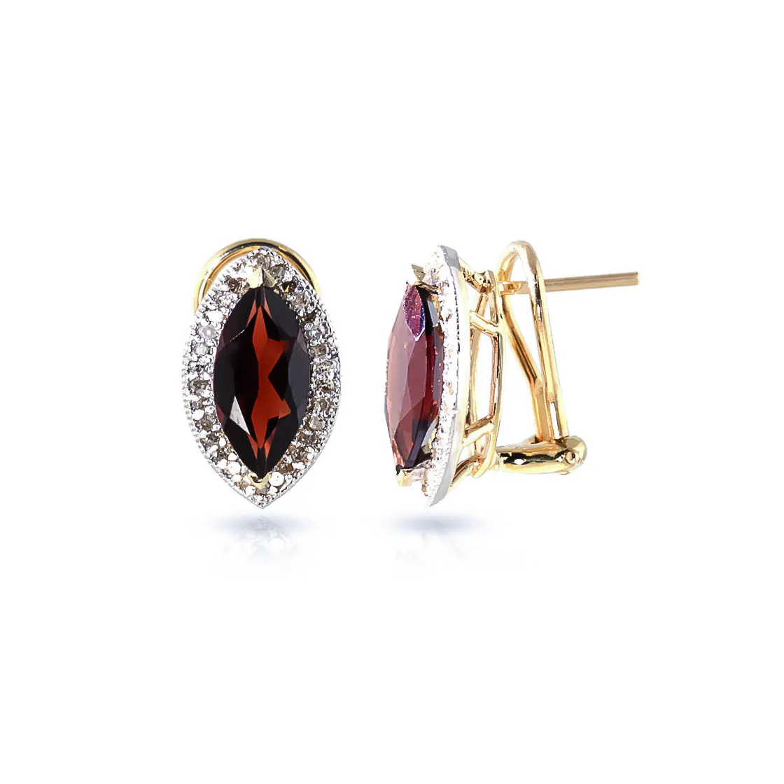 Garnet & Diamond French Clip Earrings handcrafted in solid gold. Two genuine garnets, total 4 ct, 60 diamonds, total 0.3 ct for both earrings combined. Marquise cut. Size: 9.9 x 16 mm (0.39 x 0.63 in). Material: 9ct Gold. Total metal weight: 4.0 gr. 2 marquise cut garnets (12 x 6 mm) = 4 ct total for pair. 60 round cut diamonds (K colour, I3 clarity) = 0.3 ct total for pair. Colour: Red. Stone cut: Marquise Cut. Anniversary: 2nd Anniversary. Birthstone: January.