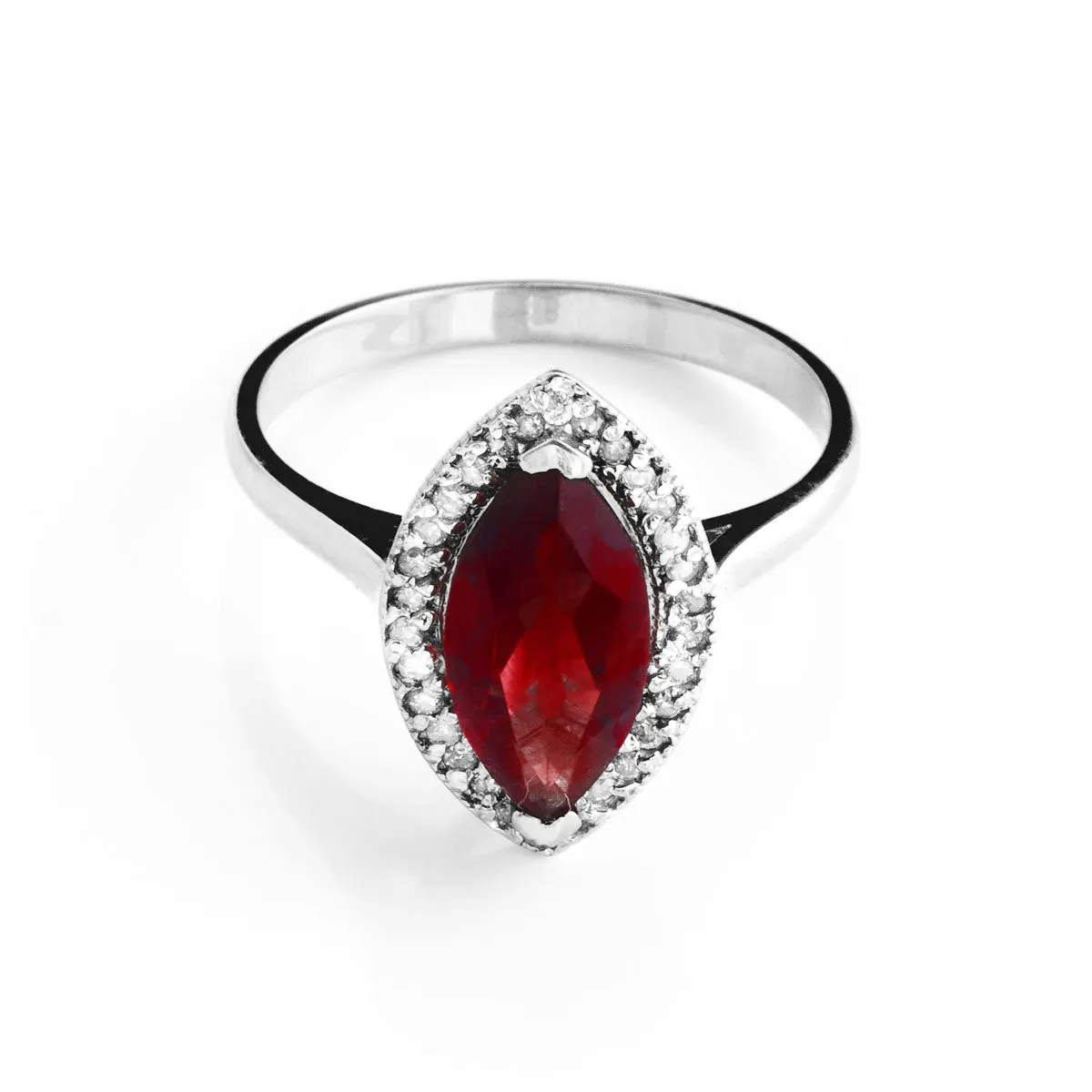 Garnet & Diamond Ring handcrafted in solid sterling silver. Single 2 ct genuine garnet, 30 diamonds, total 0.15 ct. Marquise cut. Available from sizes H to Z including half sizes. Size: 16.3 mm (0.64 in). Material: Sterling Silver. Total metal weight: 3.3 gr. 1 marquise cut garnet (12 x 6 mm) = 2 ct. 30 round cut diamonds (K colour, I3 clarity) = 0.15 ct total. Colour: Red. Stone cut: Marquise Cut. Anniversary: 2nd Anniversary. Birthstone: January.