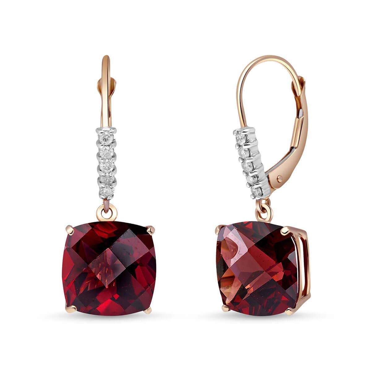 Garnet & Diamond Leverback Earrings handcrafted in rose gold plated 9ct gold. Two genuine garnets, total 9 ct, ten diamonds, total 0.15 ct for both earrings combined. Cushion cut. Size: 9.9 x 27.9 mm (0.39 x 1.1 in). Material: 9ct Rose Gold. Total metal weight: 3.3 gr. 2 cushion cut garnets (10 x 10 mm) = 9 ct total for pair. 10 round cut diamonds (I colour, SI2 clarity) = 0.15 ct total for pair. Colour: Red. Stone cut: Cushion Cut. Anniversary: 2nd Anniversary. Birthstone: January.