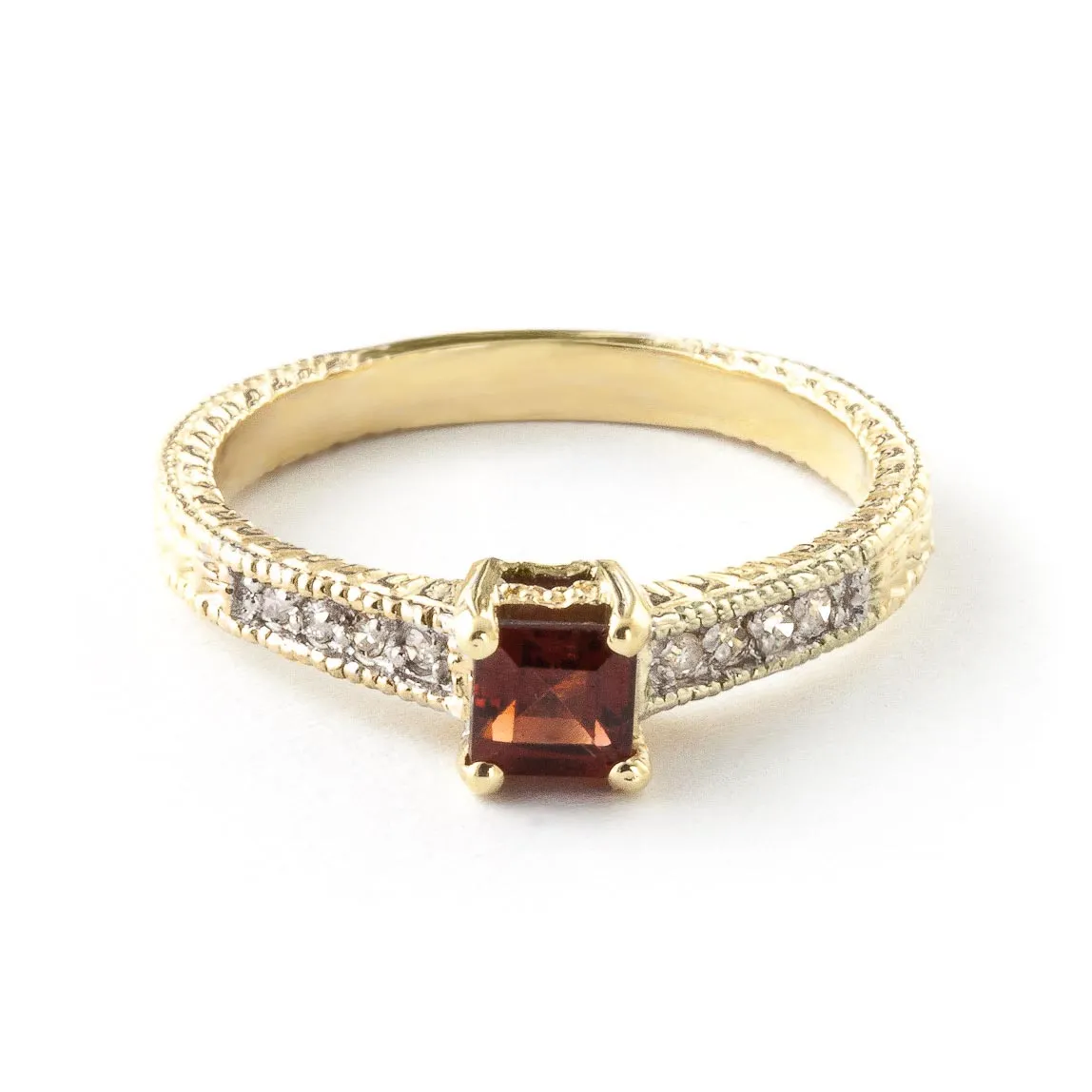 Garnet & Diamond Ring handcrafted in solid gold. Single 0.5 ct genuine garnet, eight diamonds, total 0.15 ct. Princess cut. Available from sizes H to Z including half sizes. Size: 2.5 mm (0.1 in). Material: 9ct Gold. Total metal weight: 2.6 gr. 1 princess cut garnet (4 x 4 mm) = 0.5 ct. 8 round cut diamonds (K colour, SI2 clarity) = 0.15 ct total. Colour: Red. Stone cut: Princess Cut. Anniversary: 2nd Anniversary. Birthstone: January.