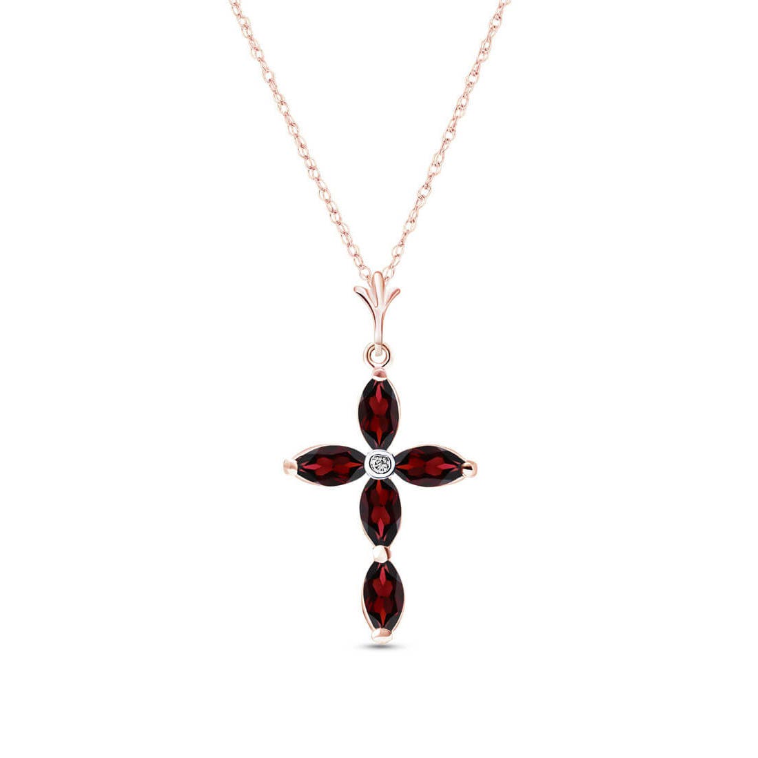 Garnet & Diamond Pendant Necklace handcrafted in rose gold plated 9ct gold. Five genuine garnets, total 1.08 ct, single 0.15 ct diamond. Marquise cut. The pendant hangs from a rose gold double link rope chain with spring clasp. Size: 15.2 x 28.7 mm (0.6 x 1.13 in). Material: 9ct Rose Gold. Total metal weight: 1.94 gr. 5 marquise cut garnets (6 x 3 mm) = 1.08 ct total. 1 round brilliant cut diamond (K colour, SI2 clarity) = 0.15 ct. Colour: Red. Stone cut: Marquise Cut. Anniversary: 2nd Anniversary. Birthstone: January.