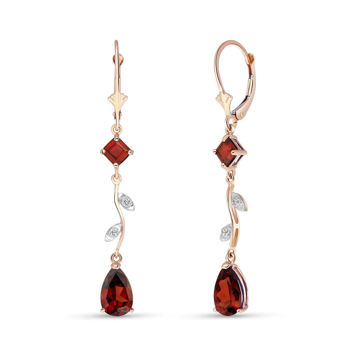 Garnet & Diamond Chandelierdrop Earrings handcrafted in rose gold plated 9ct gold. Four gemstones, total 3.95 ct, four diamonds, total 0.02 ct for both earrings combined. Square cut. Size: 6.1 x 48.3 mm (0.24 x 1.9 in). Material: 9ct Rose Gold. Total metal weight: 2.6 gr. 2 square cut garnets (4 x 4 mm) = 0.95 ct total for pair. 2 pear cut garnets (9 x 6 mm) = 3 ct total for pair. 4 round cut diamonds (K colour, SI1 clarity) = 0.02 ct total for pair. Colour: Red. Stone cut: Square Cut. Anniversary: 2nd Anniversary. Birthstone: January.