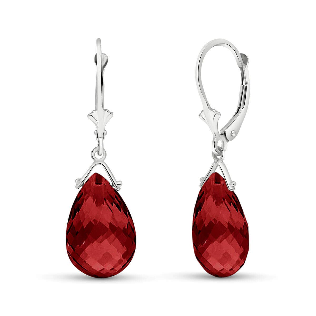 Garnet Leverback Earrings handcrafted in solid white gold. Two genuine garnets, total 10.2 ct for both earrings combined. Briolette cut. Size: 10.2 x 33 mm (0.4 x 1.3 in). Material: 9ct White Gold. Total metal weight: 2.7 gr. 2 briolette cut garnets (15 x 10 mm) = 10.2 ct total for pair. Colour: Red. Stone cut: Briolette Cut. Anniversary: 2nd Anniversary. Birthstone: January.