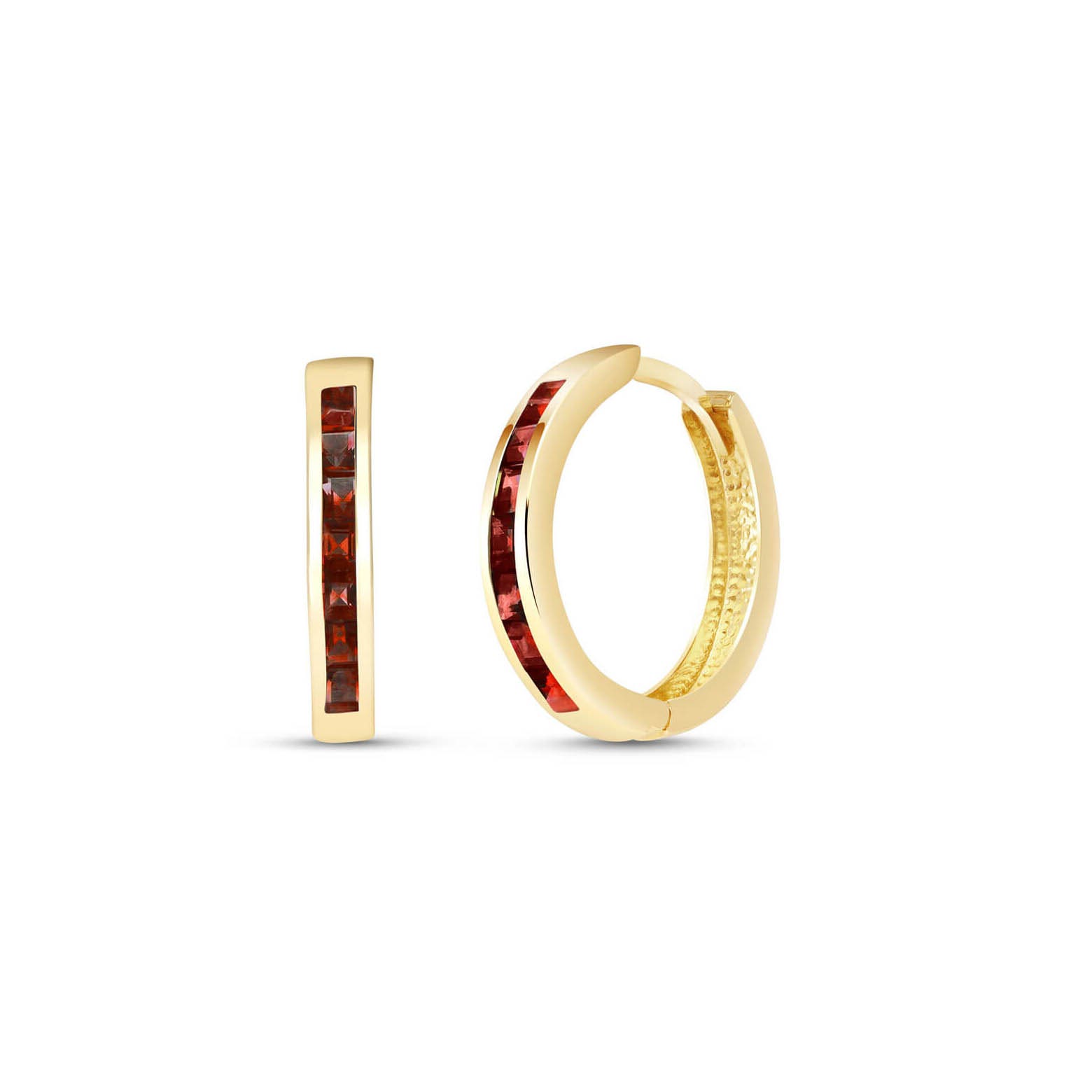Garnet Hoop Huggie Earrings handcrafted in solid gold. 14 genuine garnets, total 1.85 ct for both earrings combined. Princess cut. Size: 3.3 x 19.1 mm (0.13 x 0.75 in). Material: 9ct Gold. Total metal weight: 2.6 gr. 14 princess cut garnets (2.5 x 2.5 mm) = 1.85 ct total for pair. Colour: Red. Stone cut: Princess Cut. Anniversary: 2nd Anniversary. Birthstone: January.