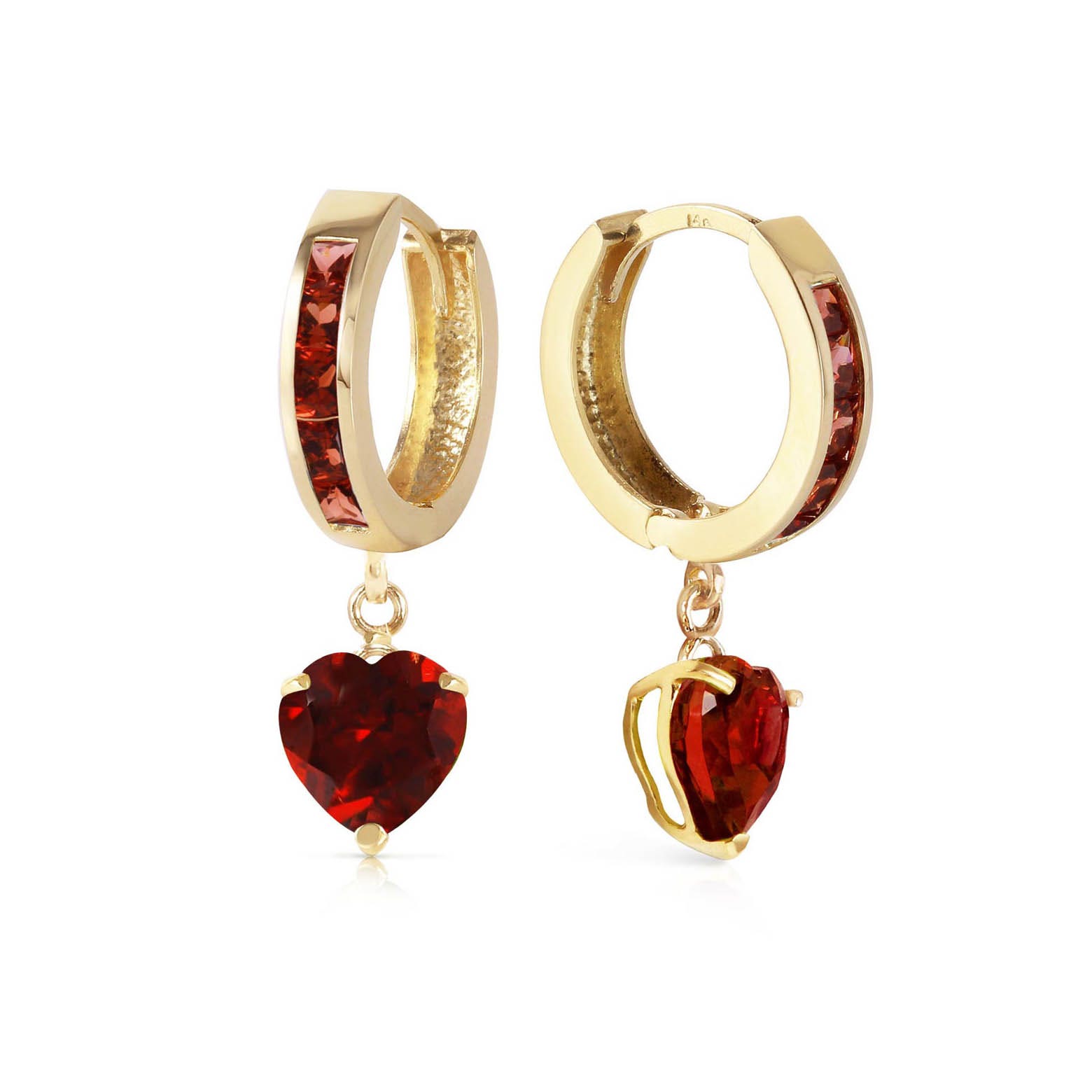 Garnet Hoop Earrings handcrafted in solid gold. Twelve gemstones, total 3.85 ct for both earrings combined. Princess cut. Size: 7.1 x 25.9 mm (0.28 x 1.02 in). Material: 9ct Gold. Total metal weight: 1.9 gr. 10 princess cut garnets (2.5 x 2.5 mm) = 0.85 ct total for pair. 2 heart shaped garnets (7 x 7 mm) = 3 ct total for pair. Colour: Red. Stone cut: Princess Cut. Anniversary: 2nd Anniversary. Birthstone: January.