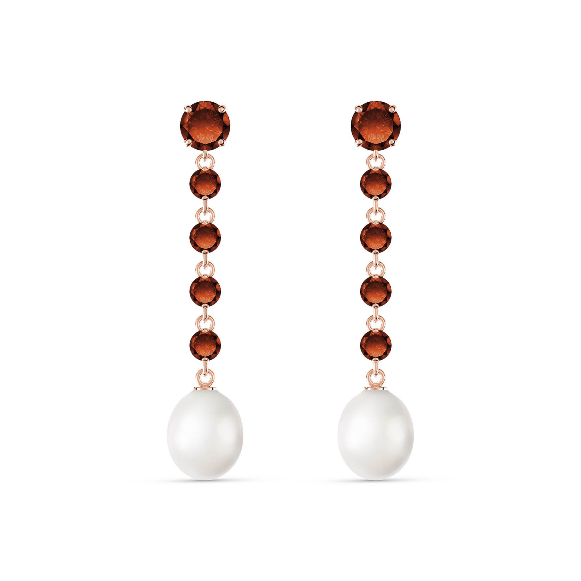 Garnet & Pearl Chandelierdrop Earrings handcrafted in rose gold plated 9ct gold. Twelve gemstones, total 10 ct for both earrings combined. Round cut. Size: 7.4 x 44.5 mm (0.29 x 1.75 in). Material: 9ct Rose Gold. Total metal weight: 3.4 gr. 2 round cut garnets (5 x 5 mm) = 1 ct total for pair. 8 round cut garnets (3 x 3 mm) = 1 ct total for pair. 2 freshwater pearls (10 x 8 mm) = 8 ct total for pair. Colour: Red. Stone cut: Round Cut. Anniversary: 2nd Anniversary. Birthstone: January.