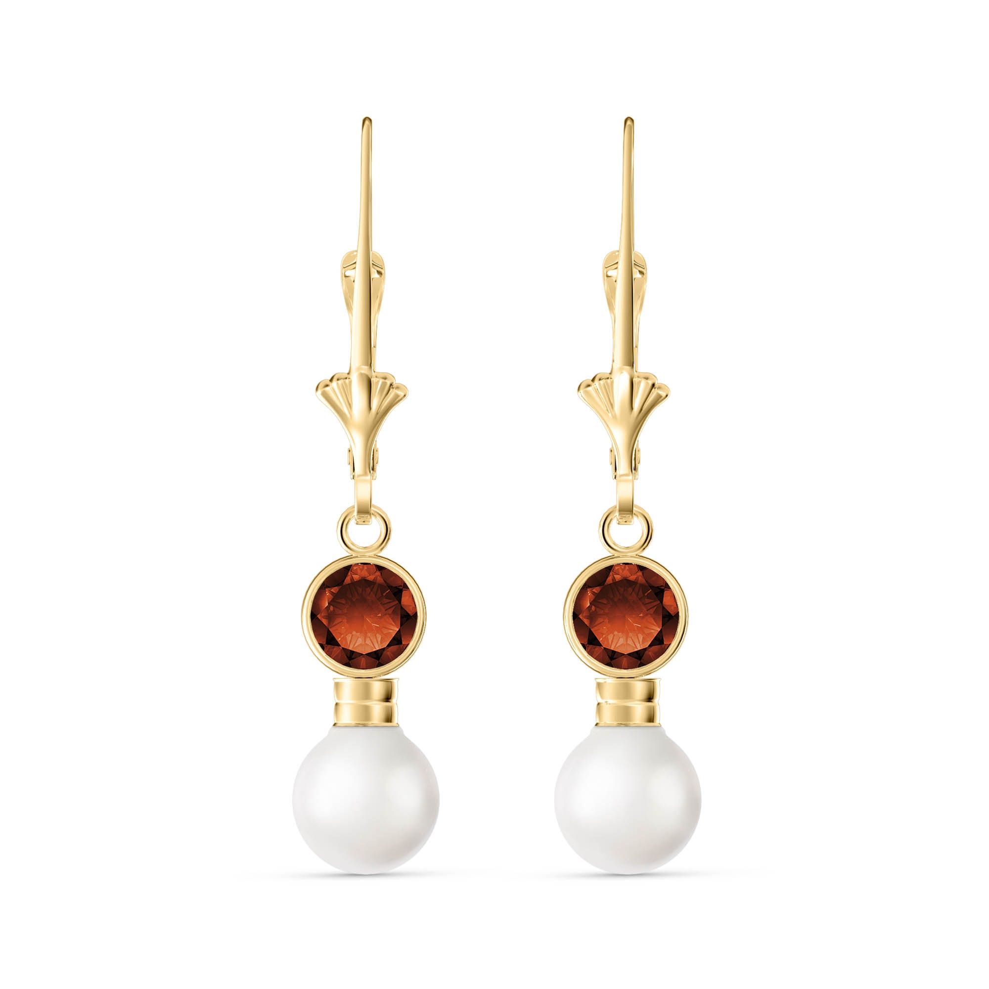 Garnet & Pearl Leverback Earrings handcrafted in solid gold. Four gemstones, total 2.7 ct for both earrings combined. Round cut. Size: 7.1 x 32.3 mm (0.28 x 1.27 in). Material: 9ct Gold. Total metal weight: 2.0 gr. 2 round cut garnets (5 x 5 mm) = 1.2 ct total for pair. 2 freshwater pearls (7 x 7 mm) = 1.5 ct total for pair. Colour: Red. Stone cut: Round Cut. Anniversary: 2nd Anniversary. Birthstone: January.