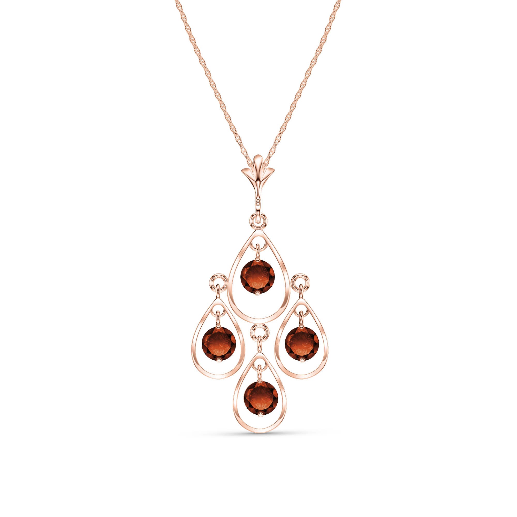 Garnet Pendant Necklace handcrafted in rose gold plated 9ct gold. Four genuine garnets, total 1.2 ct. Round cut. The pendant is suspended from a rose gold double link rope chain with spring clasp. Size: 18 x 33 mm (0.71 x 1.3 in). Material: 9ct Rose Gold. Total metal weight: 2.04 gr. 4 round cut garnets (4 x 4 mm) = 1.2 ct total. Colour: Red. Stone cut: Round Cut. Anniversary: 2nd Anniversary. Birthstone: January.