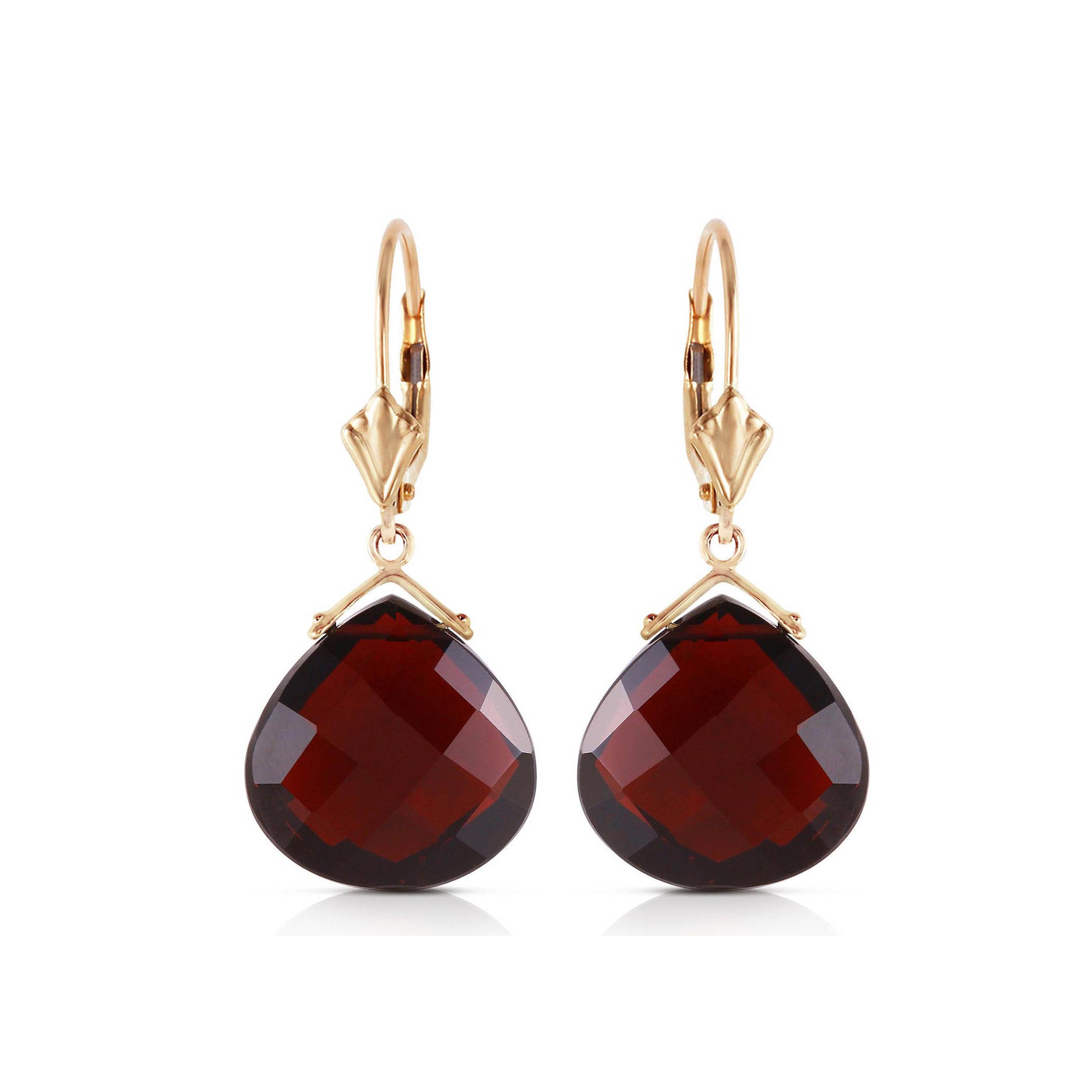 Garnet Leverback Earrings handcrafted in rose gold plated 9ct gold. Two genuine garnets, total 17 ct for both earrings combined. Heart shaped. Size: 14 x 33 mm (0.55 x 1.3 in). Material: 9ct Rose Gold. Total metal weight: 3.7 gr. 2 heart shaped garnets (14 x 14 mm) = 17 ct total for pair. Colour: Red. Stone cut: Heart Shaped. Anniversary: 2nd Anniversary. Birthstone: January.