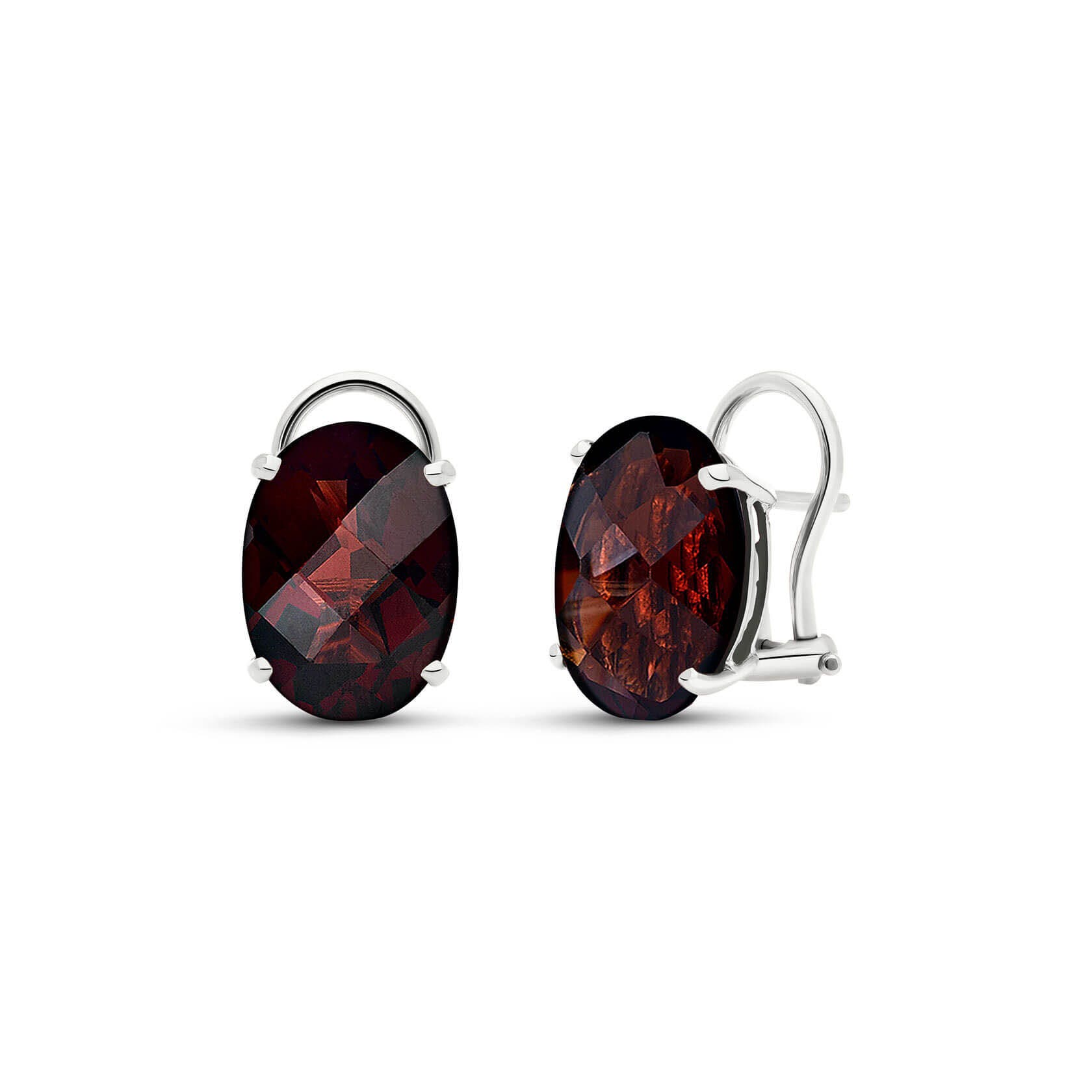 Garnet Stud Earrings handcrafted in solid white gold. Two genuine garnets, total 12 ct for both earrings combined. Oval cut. Post with friction back to fasten. Size: 10.2 x 14 mm (0.4 x 0.55 in). Material: 9ct White Gold. Total metal weight: 4.3 gr. 2 oval cut garnets (14 x 10 mm) = 12 ct total for pair. Colour: Red. Stone cut: Oval Cut. Anniversary: 2nd Anniversary. Birthstone: January.