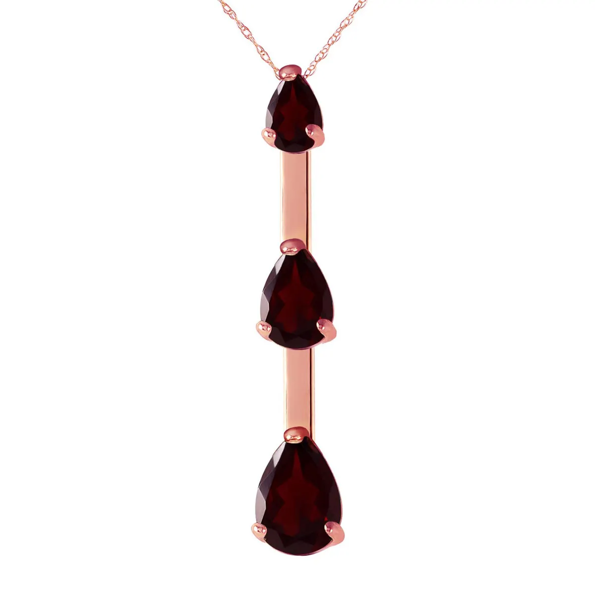 Garnet Pendant Necklace handcrafted in rose gold plated 9ct gold. Three gemstones, total 1.71 ct. Pear cut. The pendant hangs from a rose gold double link rope chain with spring clasp. Size: 4.8 x 28.7 mm (0.19 x 1.13 in). Material: 9ct Rose Gold. Total metal weight: 1.94 gr. 1 pear cut garnet (5 x 3 mm) = 0.26 ct. 1 pear cut garnet (6 x 4 mm) = 0.6 ct. 1 pear cut garnet (7 x 5 mm) = 0.85 ct. Colour: Red. Stone cut: Pear Cut. Anniversary: 2nd Anniversary. Birthstone: January.