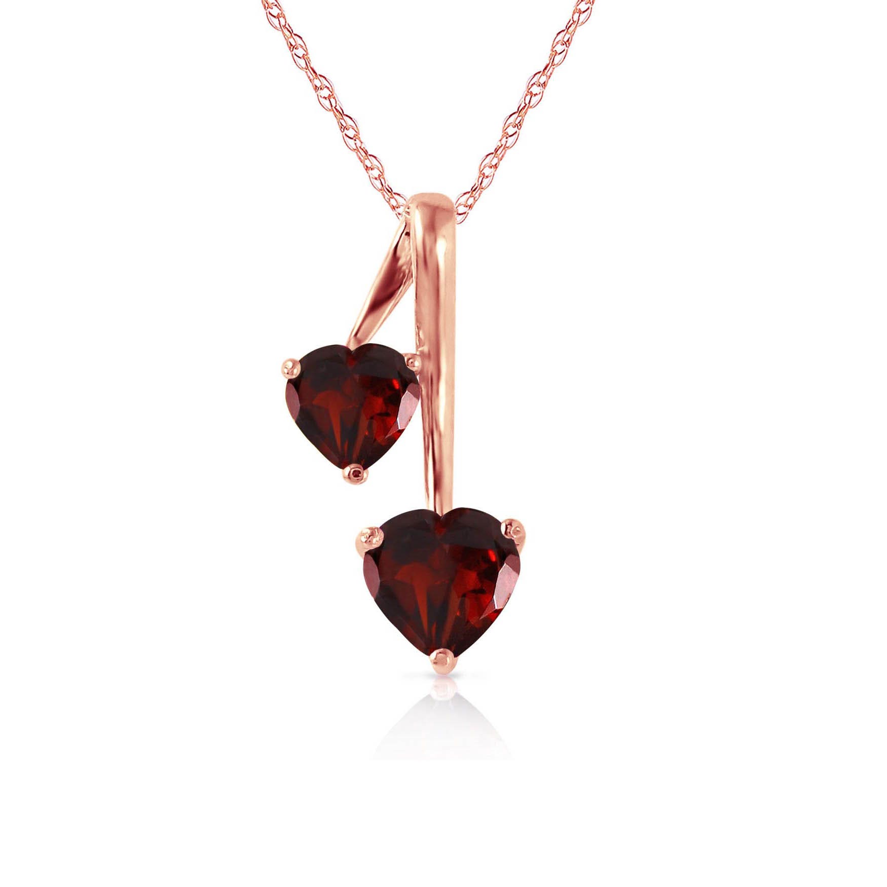 Garnet Pendant Necklace handcrafted in rose gold plated 9ct gold. Two gemstones, total 1.4 ct. Heart shaped. The pendant is suspended from a rose gold double link rope chain with spring clasp. Size: 9.7 x 20.3 mm (0.38 x 0.8 in). Material: 9ct Rose Gold. Total metal weight: 1.74 gr. 1 heart shaped garnet (6 x 6 mm) = 0.9 ct. 1 heart shaped garnet (5 x 5 mm) = 0.5 ct. Colour: Red. Stone cut: Heart Shaped. Anniversary: 2nd Anniversary. Birthstone: January.