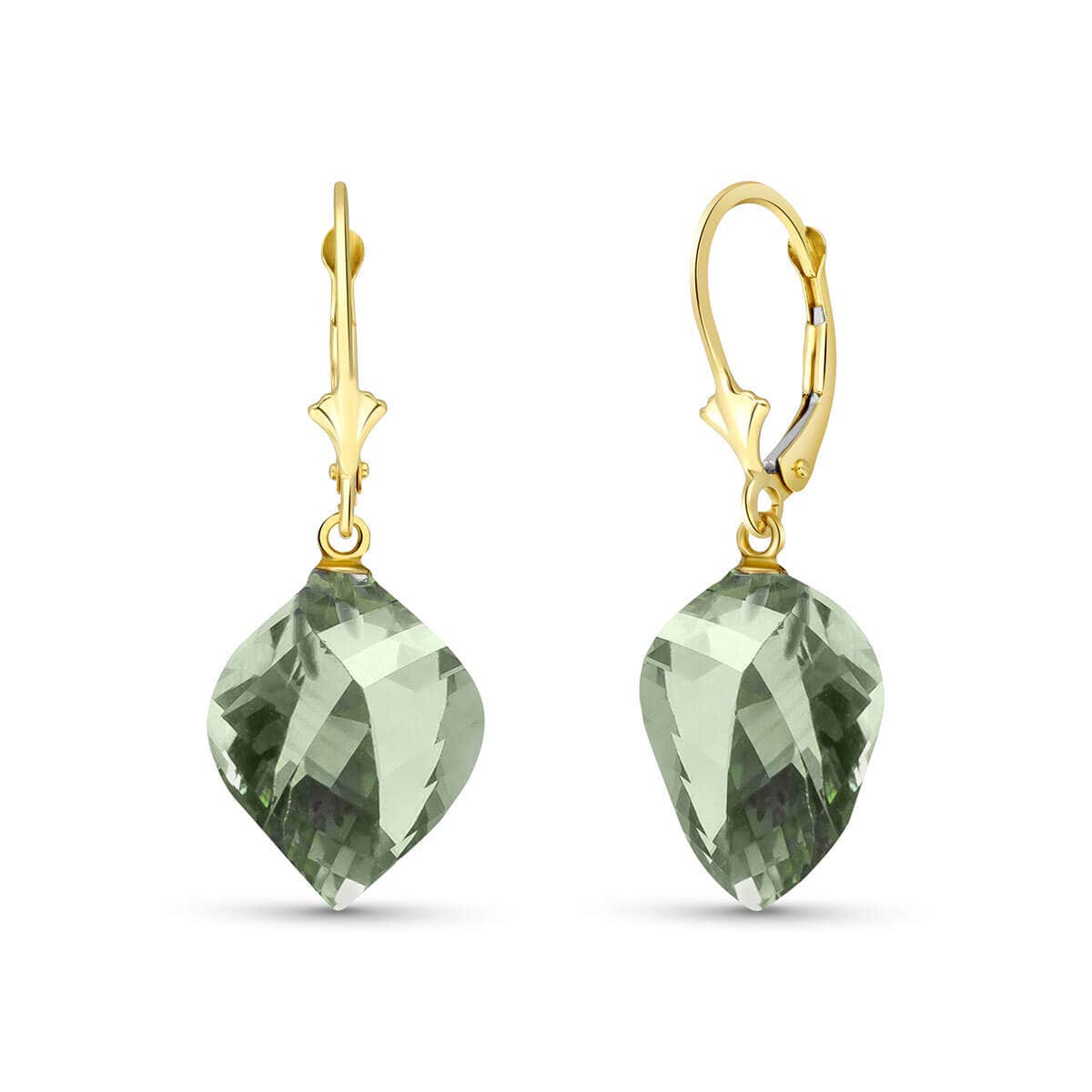Green Amethyst Leverback Earrings handcrafted in solid gold. Two genuine amethysts, total 26 ct for both earrings combined. Twisted briolette cut. Size: 12.7 x 32.5 mm (0.5 x 1.28 in). Material: 9ct Gold. Total metal weight: 5.2 gr. 2 twisted briolette cut green amethysts (15 x 13 mm) = 26 ct total for pair. Colour: Green. Stone cut: Twisted Briolette Cut. Anniversary: 6th Anniversary. Birthstone: February.