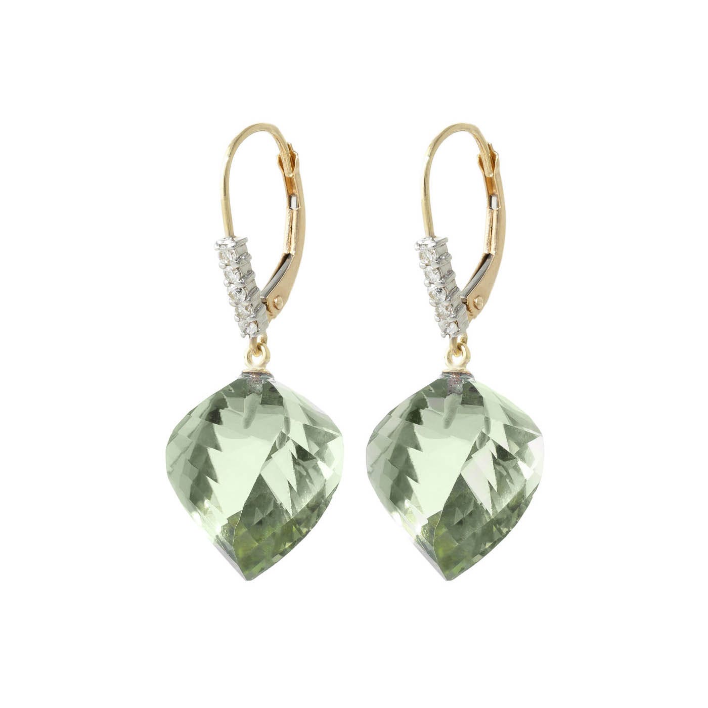 Green Amethyst & Diamond Chandelier Earrings handcrafted in solid gold. Two genuine amethysts, total 26 ct, ten diamonds, total 0.15 ct for both earrings combined. Twisted briolette cut. Size: 12.7 x 32.5 mm (0.5 x 1.28 in). Material: 9ct Gold. Total metal weight: 4.6 gr. 2 twisted briolette cut green amethysts (15 x 13 mm) = 26 ct total for pair. 10 round cut diamonds (K colour, I3 clarity) = 0.15 ct total for pair. Colour: Green. Stone cut: Twisted Briolette Cut. Anniversary: 6th Anniversary. Birthstone: February.
