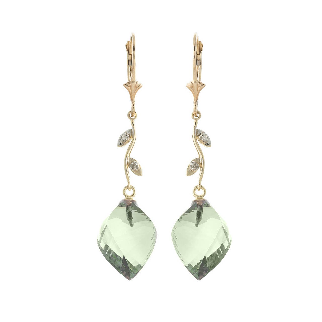 Green Amethyst & Diamond Chandelier Earrings handcrafted in solid gold. Two genuine amethysts, total 26 ct, four diamonds, total 0.02 ct for both earrings combined. Twisted briolette cut. Size: 12.7 x 47.8 mm (0.5 x 1.88 in). Material: 9ct Gold. Total metal weight: 5.8 gr. 2 twisted briolette cut green amethysts (15 x 13 mm) = 26 ct total for pair. 4 round cut diamonds (K colour, I3 clarity) = 0.02 ct total for pair. Colour: Green. Stone cut: Twisted Briolette Cut. Anniversary: 6th Anniversary. Birthstone: February.