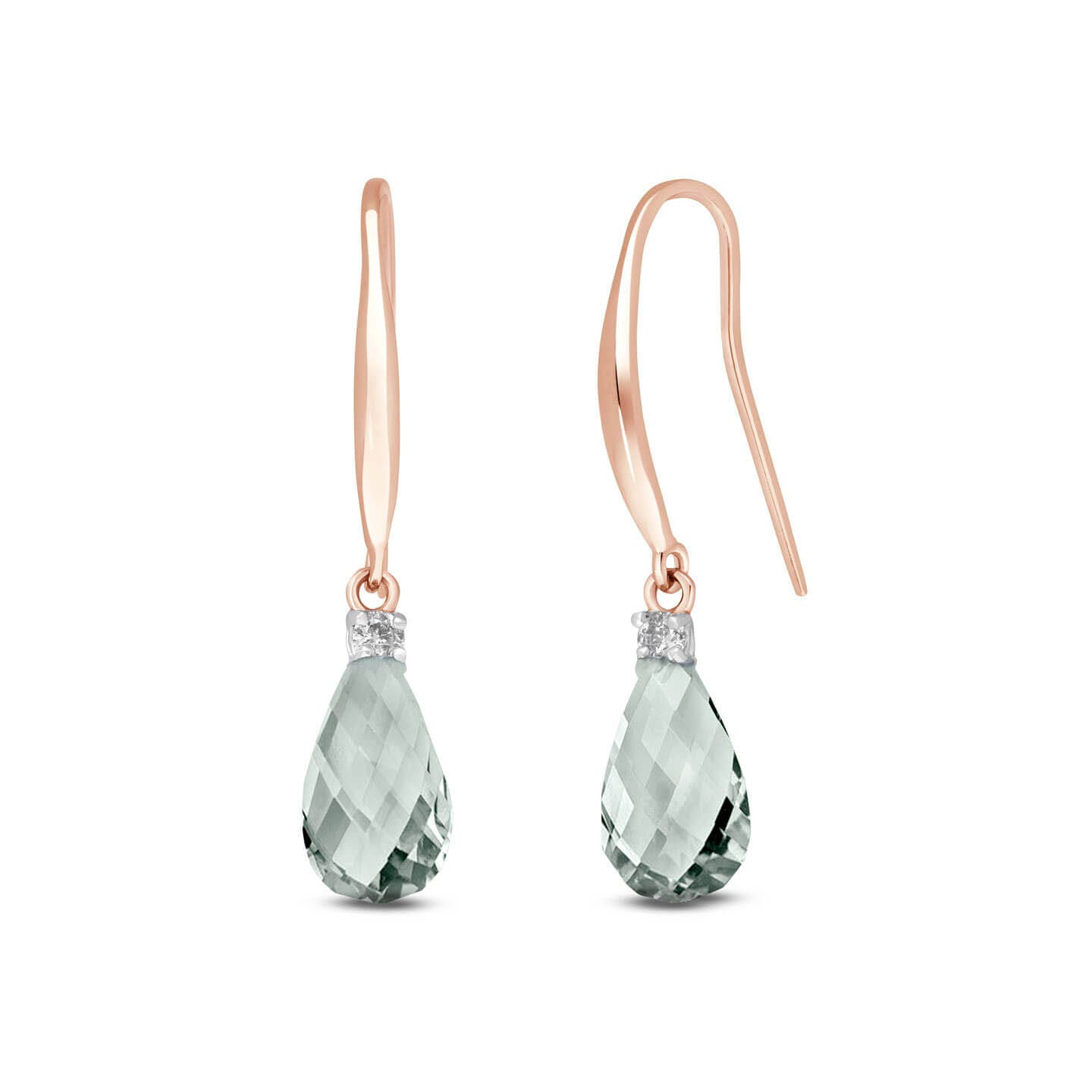 Green Amethyst & Diamond Fish Hook Earrings handcrafted in rose gold plated 9ct gold. Two genuine amethysts, total 4.5 ct, two diamonds, total 0.1 ct for both earrings combined. Briolette cut. Size: 6.1 x 28.7 mm (0.24 x 1.13 in). Material: 9ct Rose Gold. Total metal weight: 2.0 gr. 2 briolette cut green amethysts (9 x 6 mm) = 4.5 ct total for pair. 2 round cut diamonds (I colour, SI1 clarity) = 0.1 ct total for pair. Colour: Green. Stone cut: Briolette Cut. Anniversary: 6th Anniversary. Birthstone: February.