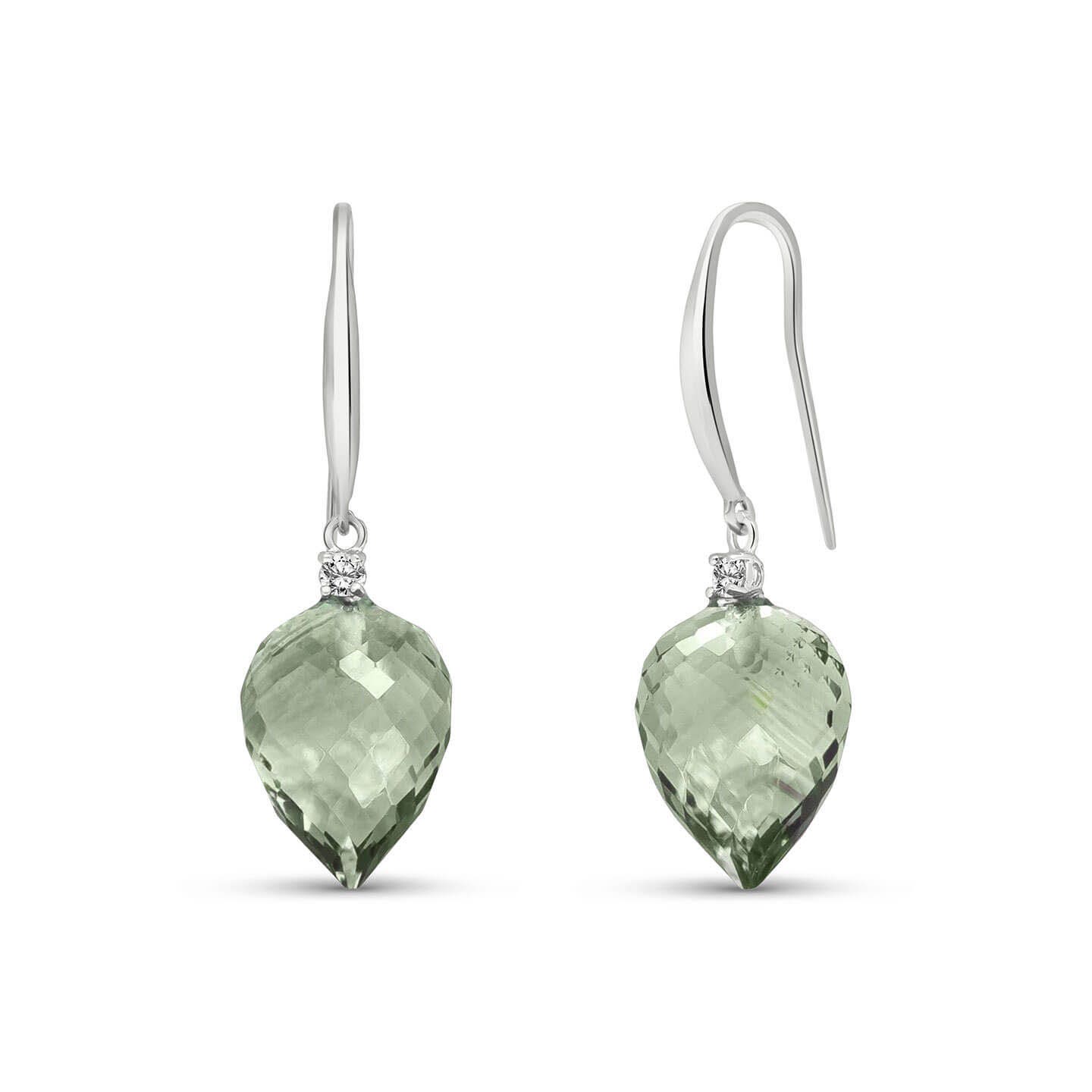 Green Amethyst & Diamond Fish Hook Earrings handcrafted in solid white gold. Two genuine amethysts, total 19 ct, two diamonds, total 0.1 ct for both earrings combined. Pointed briolette cut. Size: 10.2 x 34.8 mm (0.4 x 1.37 in). Material: 9ct White Gold. Total metal weight: 4.0 gr. 2 pointed briolette cut green amethysts (15 x 10 mm) = 19 ct total for pair. 2 round cut diamonds (K colour, I3 clarity) = 0.1 ct total for pair. Colour: Green. Stone cut: Pointed Briolette Cut. Anniversary: 6th Anniversary. Birthstone: February.