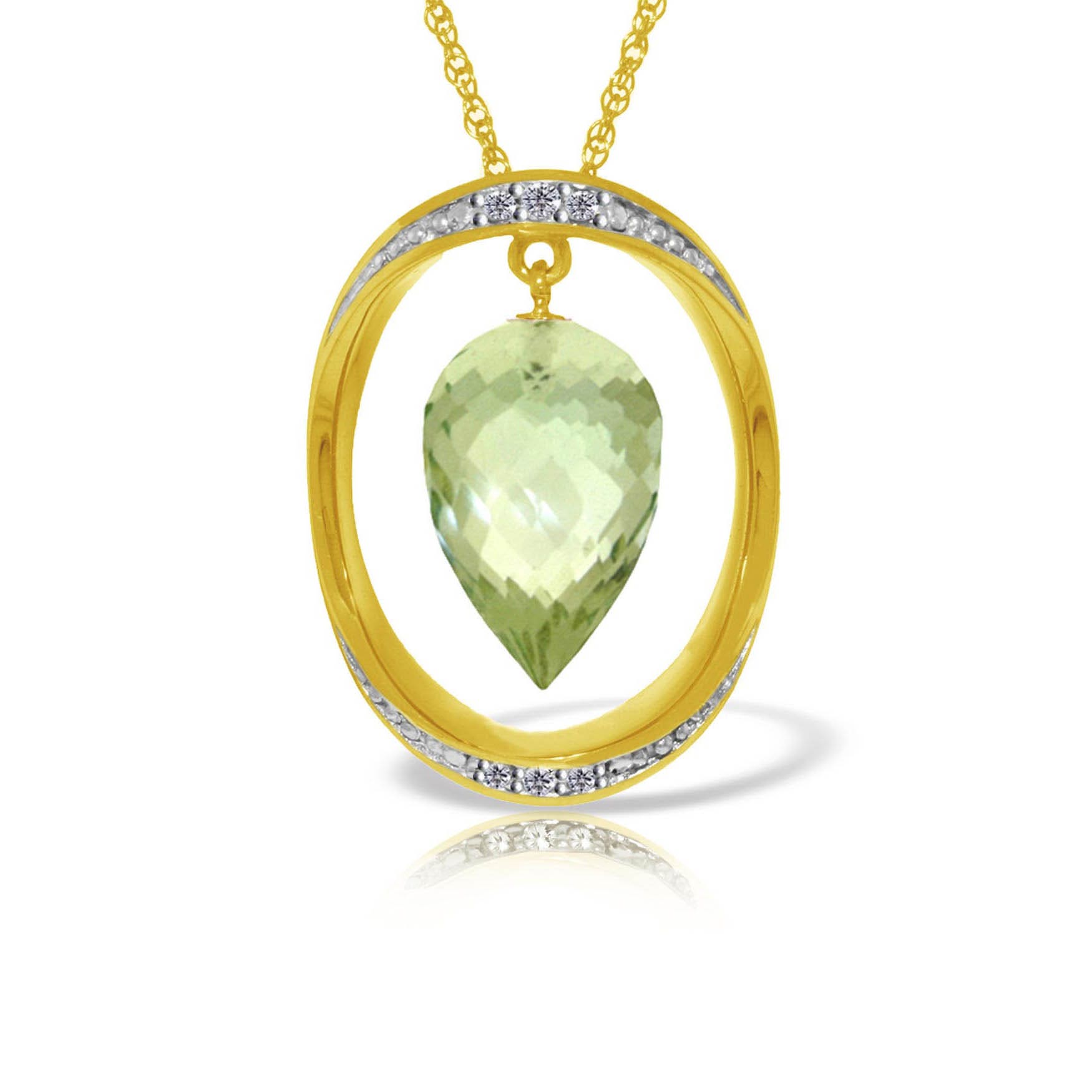 Green Amethyst & Diamond Drop Pendant Necklace handcrafted in solid gold. Single 9.5 ct genuine amethyst, six diamonds, total 0.1 ct. Pointed briolette cut. The pendant hangs from a gold double link rope chain with spring clasp. Size: 19.1 x 25.4 mm (0.75 x 1 in). Material: 9ct Gold. Total metal weight: 5.34 gr. 1 pointed briolette cut green amethyst (15 x 10 mm) = 9.5 ct. 6 round cut diamonds (G colour, SI1 clarity) = 0.1 ct total. Colour: Green. Stone cut: Pointed Briolette Cut. Anniversary: 6th Anniversary. Birthstone: February.