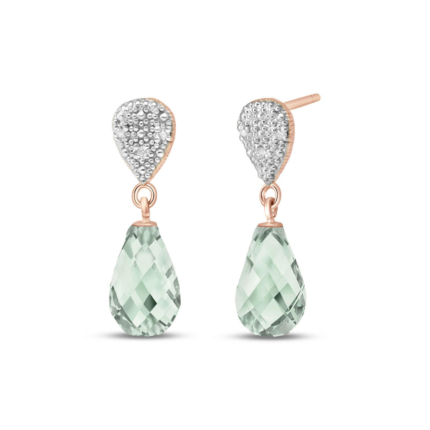 Green Amethyst & Diamond Chandelier Earrings handcrafted in rose gold plated 9ct gold. Two genuine amethysts, total 4.5 ct, six diamonds, total 0.03 ct for both earrings combined. Briolette cut. Size: 6.1 x 20.3 mm (0.24 x 0.8 in). Material: 9ct Rose Gold. Total metal weight: 1.8 gr. 2 briolette cut green amethysts (9 x 6 mm) = 4.5 ct total for pair. 6 round cut diamonds (K colour, I3 clarity) = 0.03 ct total for pair. Colour: Green. Stone cut: Briolette Cut. Anniversary: 6th Anniversary. Birthstone: February.