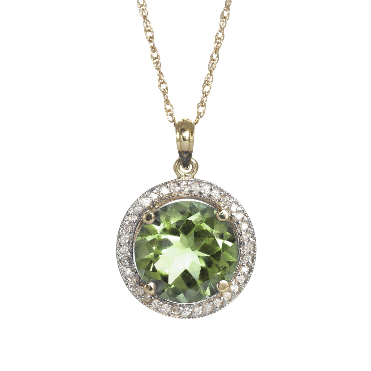 Green Amethyst & Diamond Pendant Necklace handcrafted in solid gold. Single 5 ct genuine amethyst, 36 diamonds, total 0.2 ct. Round cut. The pendant hangs from a gold double link rope chain with spring clasp. Size: 16.3 x 24.6 mm (0.64 x 0.97 in). Material: 9ct Gold. Total metal weight: 3.64 gr. 1 round cut green amethyst (12 x 12 mm) = 5 ct. 36 round cut diamonds (K colour, I3 clarity) = 0.2 ct total. Colour: Green. Stone cut: Round Cut. Anniversary: 6th Anniversary. Birthstone: February.
