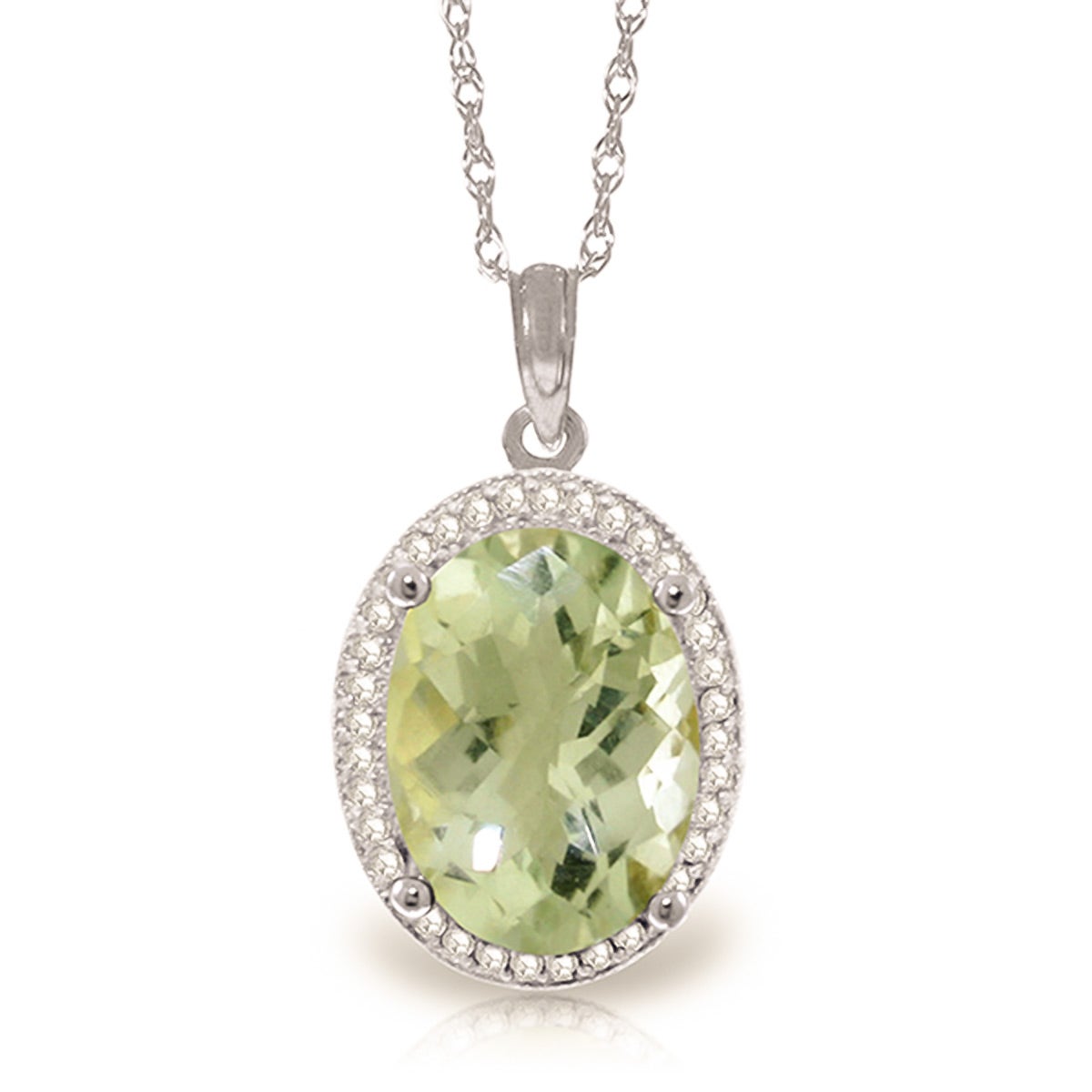 Green Amethyst & Diamond Pendant Necklace handcrafted in solid white gold. Single 4.9 ct genuine amethyst, 36 diamonds, total 0.18 ct. Oval cut. The pendant hangs from a white gold double link rope chain with spring clasp. Size: 13.2 x 22.6 mm (0.52 x 0.89 in). Material: 9ct White Gold. Total metal weight: 3.64 gr. 1 oval cut green amethyst (14 x 10 mm) = 4.9 ct. 36 round cut diamonds (K colour, I3 clarity) = 0.18 ct total. Colour: Green. Stone cut: Oval Cut. Anniversary: 6th Anniversary. Birthstone: February.