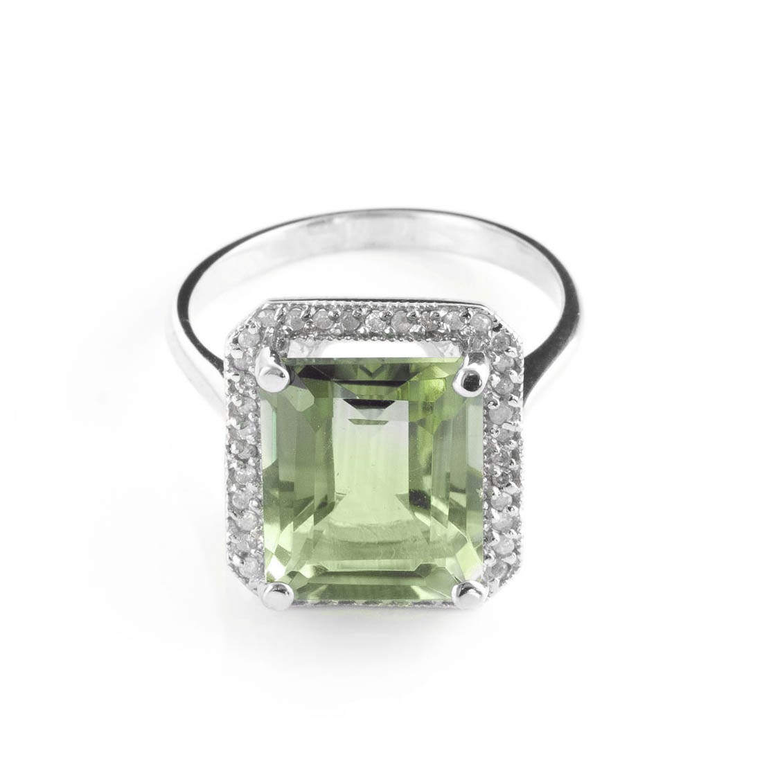 Green Amethyst & Diamond Ring handcrafted in solid 18ct white gold. Single 5.6 ct genuine amethyst, 40 diamonds, total 0.2 ct. Emerald cut. Available from sizes H to Z including half sizes. Size: 15.7 mm (0.62 in). Material: 18ct White Gold. Total metal weight: 4.9 gr. 1 emerald cut green amethyst (12 x 10 mm) = 5.6 ct. 40 round cut diamonds (K colour, I3 clarity) = 0.2 ct total. Colour: Green. Stone cut: Emerald Cut. Anniversary: 6th Anniversary. Birthstone: February.