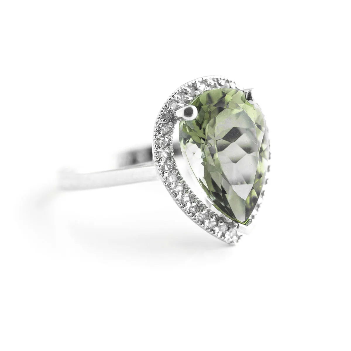 Green Amethyst & Diamond Ring handcrafted in solid white gold. Single 3.25 ct genuine amethyst, 32 diamonds, total 0.16 ct. Pear cut. Available from sizes H to Z including half sizes. Size: 16.3 mm (0.64 in). Material: 9ct White Gold. Total metal weight: 3.1 gr. 1 pear cut green amethyst (13 x 9 mm) = 3.25 ct. 32 round cut diamonds (K colour, I3 clarity) = 0.16 ct total. Colour: Green. Stone cut: Pear Cut. Anniversary: 6th Anniversary. Birthstone: February.
