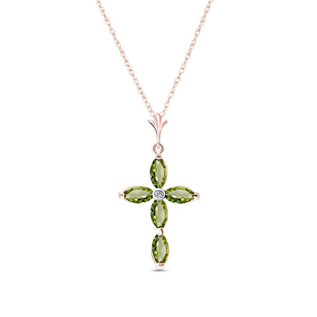 Green Amethyst & Diamond Pendant Necklace handcrafted in rose gold plated 9ct gold. Five genuine amethysts, total 1.08 ct, single 0.02 ct diamond. Marquise cut. The pendant is suspended from a rose gold double link rope chain with spring clasp. Size: 15.2 x 28.7 mm (0.6 x 1.13 in). Material: 9ct Rose Gold. Total metal weight: 1.94 gr. 5 marquise cut green amethysts (6 x 3 mm) = 1.08 ct total. 1 round brilliant cut diamond (K colour, SI2 clarity) = 0.02 ct. Colour: Green. Stone cut: Marquise Cut. Anniversary: 6th Anniversary. Birthstone: February.