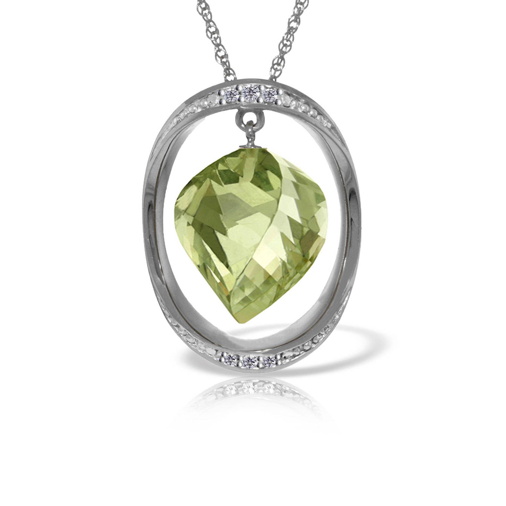 Green Amethyst & Diamond Pendant Necklace handcrafted in solid white gold. Single 15.25 ct genuine amethyst, six diamonds, total 0.1 ct. Twisted briolette cut. The pendant is suspended from a white gold double link rope chain with spring clasp. Size: 19.1 x 25.4 mm (0.75 x 1 in). Material: 9ct White Gold. Total metal weight: 5.94 gr. 1 twisted briolette cut green amethyst (15 x 13 mm) = 15.25 ct. 6 round cut diamonds (G colour, SI1 clarity) = 0.1 ct total. Colour: Green. Stone cut: Twisted Briolette Cut. Anniversary: 6th Anniversary. Birthstone: February.
