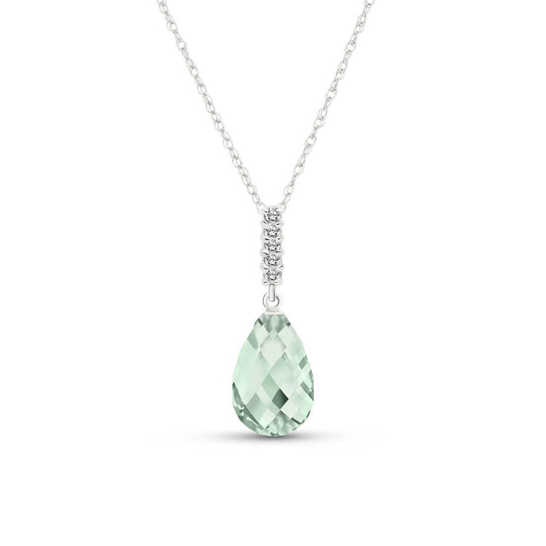 Green Amethyst & Diamond Pendant Necklace handcrafted in solid white gold. Single 5.3 ct genuine amethyst, five diamonds, total 0.08 ct. Briolette cut. The pendant is suspended from a white gold double link rope chain with spring clasp. Size: 7.9 x 24.4 mm (0.31 x 0.96 in). Material: 9ct White Gold. Total metal weight: 2.64 gr. 1 briolette cut green amethyst = 5.3 ct. 5 round cut diamonds (K colour, I3 clarity) = 0.08 ct total. Colour: Green. Stone cut: Briolette Cut. Anniversary: 6th Anniversary. Birthstone: February.
