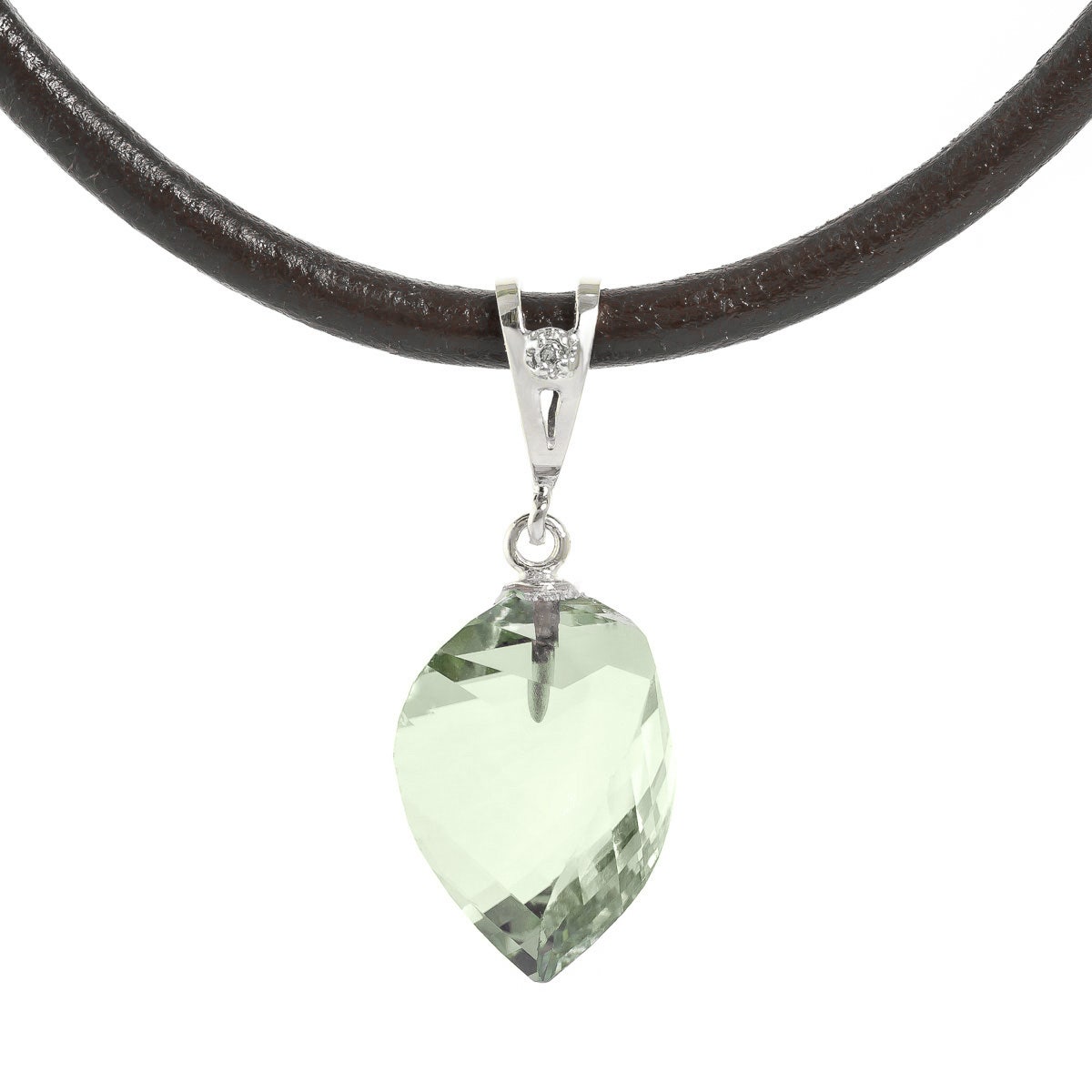 Green Amethyst & Diamond Pendant Necklace handcrafted in solid white gold. Single 13 ct genuine amethyst, single 0.01 ct diamond. Twisted briolette cut. The pendant hangs from a white gold double link rope chain with spring clasp. Size: 12.7 x 27.9 mm (0.5 x 1.1 in). Material: 9ct White Gold. Total metal weight: 5.64 gr. 1 twisted briolette cut green amethyst (15 x 13 mm) = 13 ct. 1 round brilliant cut diamond (K colour, I3 clarity) = 0.01 ct. Colour: Green. Stone cut: Twisted Briolette Cut. Anniversary: 6th Anniversary. Birthstone: February.