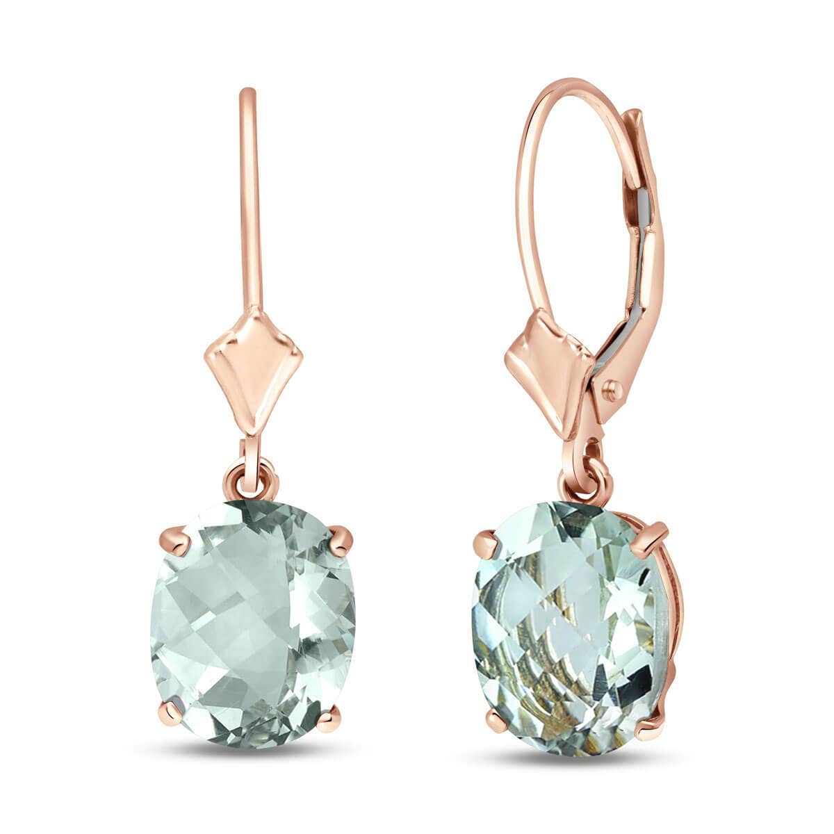 Green Amethyst Leverback Earrings handcrafted in rose gold plated 9ct gold. Two genuine amethysts, total 6.25 ct for both earrings combined. Oval cut. Size: 7.9 x 25.9 mm (0.31 x 1.02 in). Material: 9ct Rose Gold. Total metal weight: 2.7 gr. 2 oval cut green amethysts (10 x 8 mm) = 6.25 ct total for pair. Colour: Green. Stone cut: Oval Cut. Anniversary: 6th Anniversary. Birthstone: February.