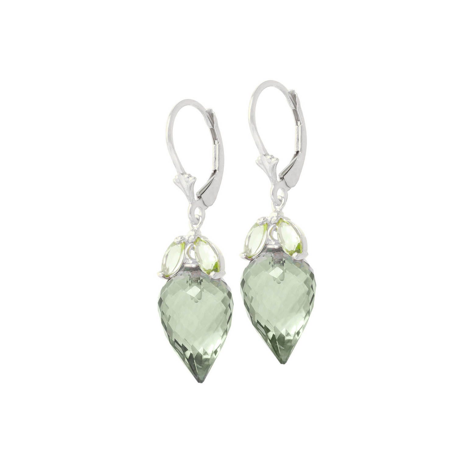 Green Amethyst & Peridot Chandelier Earrings handcrafted in solid white gold. Six gemstones, total 20 ct for both earrings combined. Pointed briolette cut. Size: 11.2 x 36.8 mm (0.44 x 1.45 in). Material: 9ct White Gold. Total metal weight: 4.8 gr. 2 pointed briolette cut green amethysts (14 x 9 mm) = 19 ct total for pair. 4 marquise cut peridots (6 x 3 mm) = 1 ct total for pair. Colour: Green. Stone cut: Pointed Briolette Cut. Anniversary: 6th Anniversary. Birthstone: February.