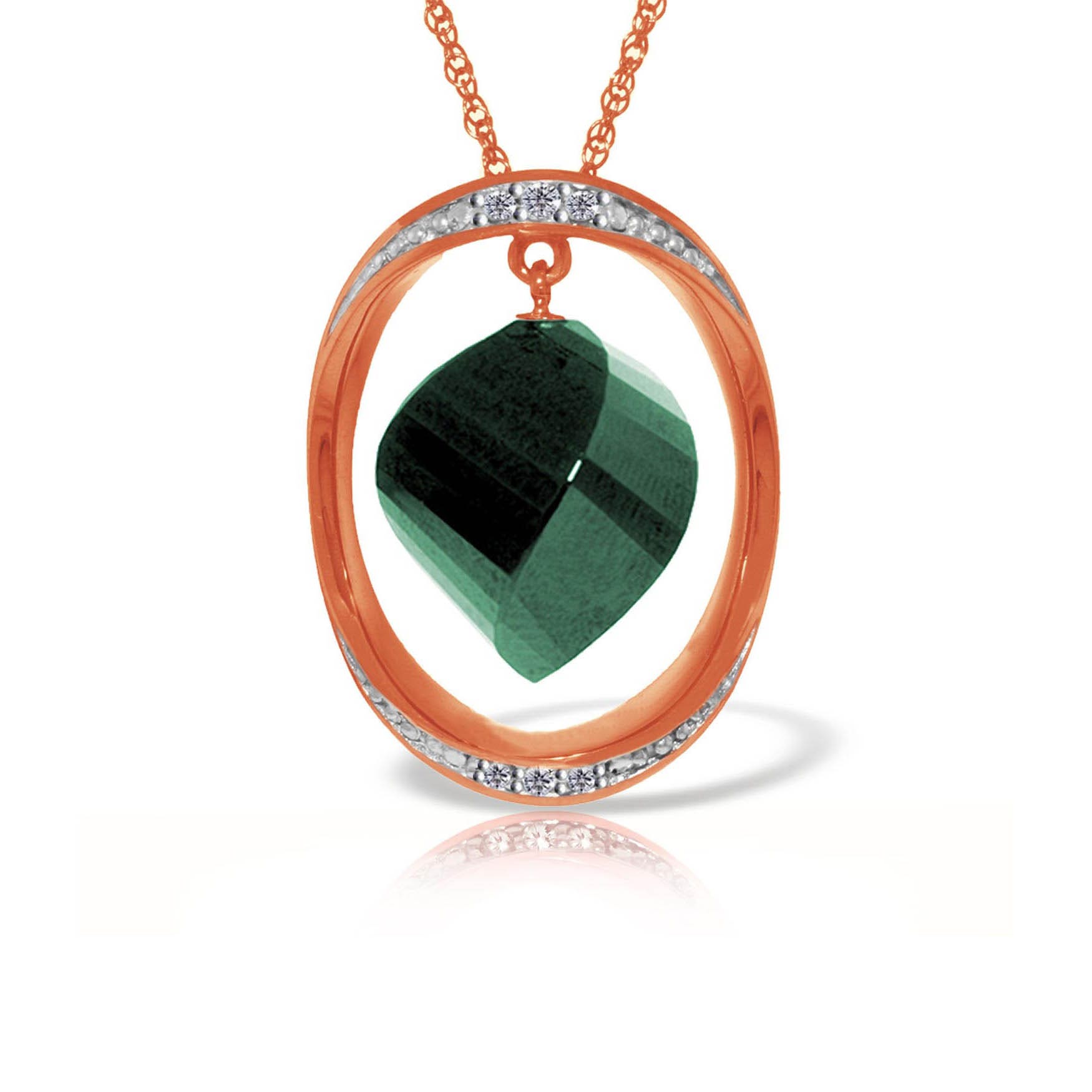 Green Sapphire & Diamond Pendant Necklace handcrafted in rose gold plated 9ct gold. Single 15.25 ct genuine sapphire, six diamonds, total 0.1 ct. Twisted briolette cut. The pendant is suspended from a rose gold double link rope chain with spring clasp. Size: 19.1 x 25.4 mm (0.75 x 1 in). Material: 9ct Rose Gold. Total metal weight: 6.34 gr. 1 twisted briolette cut green sapphire (15 x 13 mm) = 15.25 ct. 6 round cut diamonds (G colour, SI1 clarity) = 0.1 ct total. Colour: Green. Stone cut: Twisted Briolette Cut. Anniversary: 5th Anniversary, 45th Anniversary. Birthstone: September.