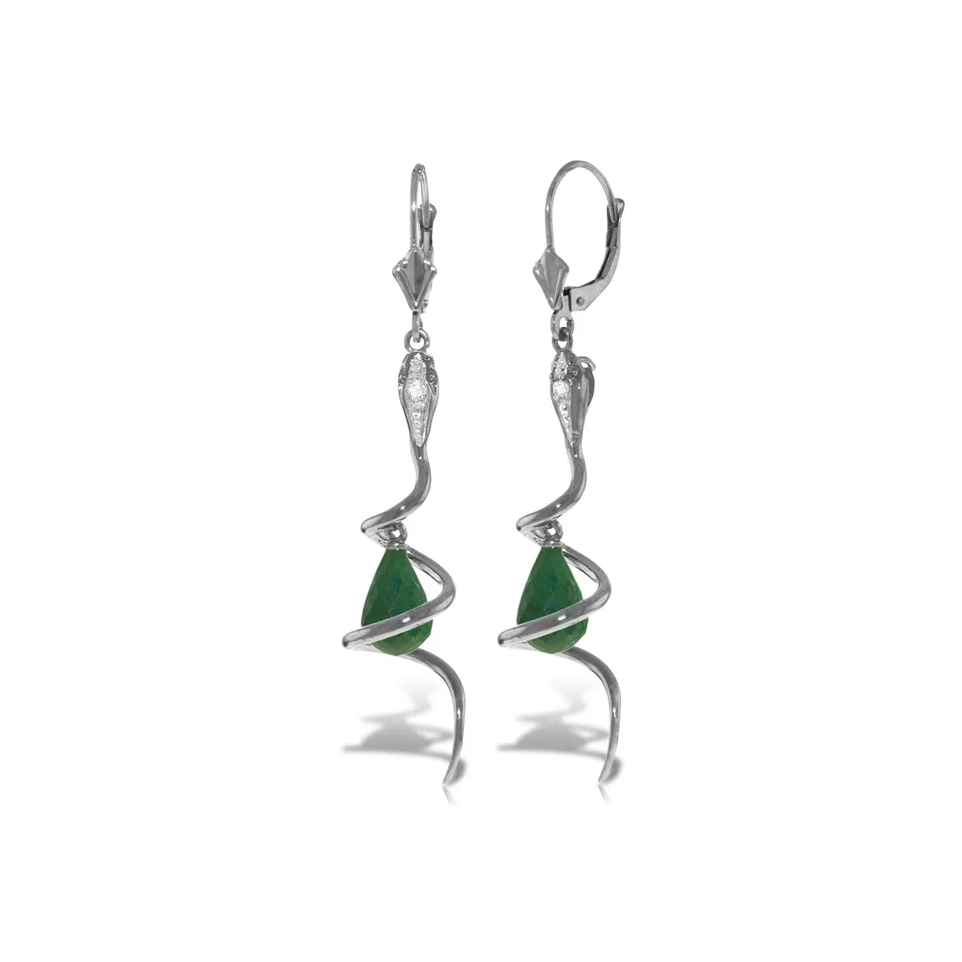 Green Sapphire & Diamond Earrings handcrafted in 9ct White Gold. Two genuine sapphires, total 6.6 ct, two diamonds, total 0.06 ct for both earrings combined. Briolette cut. Size: 10.2 x 52.6 mm (0.4 x 2.07 in). Material: 9ct White Gold. Total metal weight: 4.5 gr. 2 briolette cut green sapphires (9 x 6 mm) = 6.6 ct total for pair. 2 round cut diamonds (G colour, SI2 clarity) = 0.06 ct total for pair. Colour: Green. Stone cut: Briolette Cut. Anniversary: 5th Anniversary, 45th Anniversary. Birthstone: September.