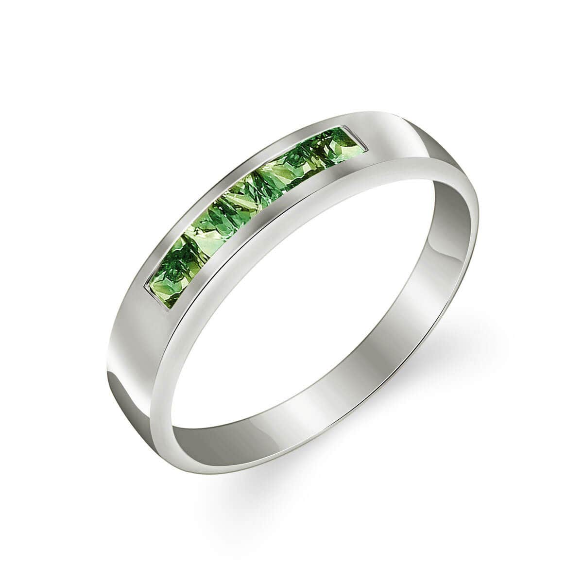 Green Sapphire Ring handcrafted in 9ct White Gold. Five genuine sapphires, total 0.6 ct. Princess cut. Available from sizes H to Z including half sizes. Size: 3.8 mm (0.15 in). Material: 9ct White Gold. Total metal weight: 2.1 gr. 5 princess cut green sapphires (2.5 x 2.5 mm) = 0.6 ct total. Colour: Green. Stone cut: Princess Cut. Anniversary: 5th Anniversary, 45th Anniversary. Birthstone: September.