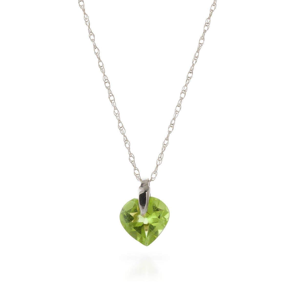 Peridot Pendant Necklace handcrafted in solid white gold. Single 1.15 ct genuine peridot. Heart shaped. The pendant hangs from a white gold double link rope chain with spring clasp. Size: 7.1 x 8.1 mm (0.28 x 0.32 in). Material: 9ct White Gold. Total metal weight: 1.34 gr. 1 heart shaped peridot (7 x 7 mm) = 1.15 ct. Colour: Green. Stone cut: Heart Shaped. Anniversary: 16th Anniversary. Birthstone: August.