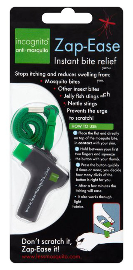 An easy and safe way to conquer the itch and need to scratch that comes with bug and mosquito bites. An essential for those who forget put on their mosquito repellent! By clicking Zap-Ease near the bite numerous times it localises the poison in the b
